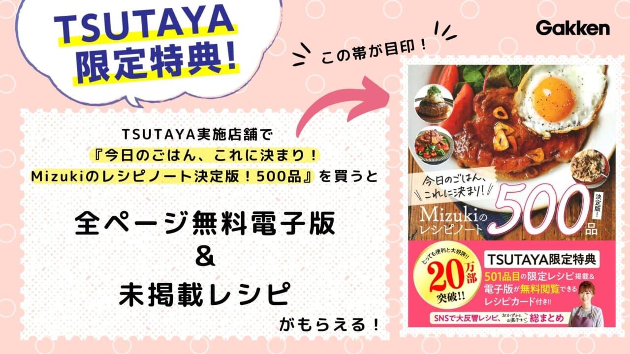 そこで、今回『Mizukiのレシピノート』をより多くの方に手に取っていただきたい、本書を通じて毎日の料理を簡単に、かつおいしくつくっていただきたい、という思いを込めて、TSUTAYA店頭にて、限定特典をご用意しました。キャンペーン期間中、TSUTAYA実施店舗にて『Mizukiのレシピノート』を購入いただいた方に、電子版を無料で閲覧できる二次元コード付き特典レシピカードをプレゼントいたします。