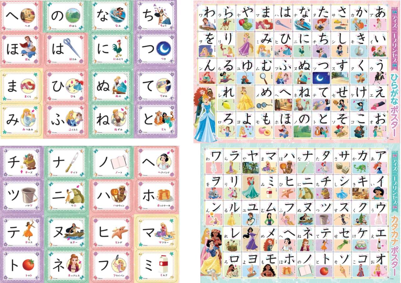 お部屋にはって毎日目にすることで、自然とひらがな・カタカナが身につくポスターと、ポスターとイラストが連動しているカード。プリンセスたちのかわいい絵柄で、楽しみながら言葉が身に付きます。