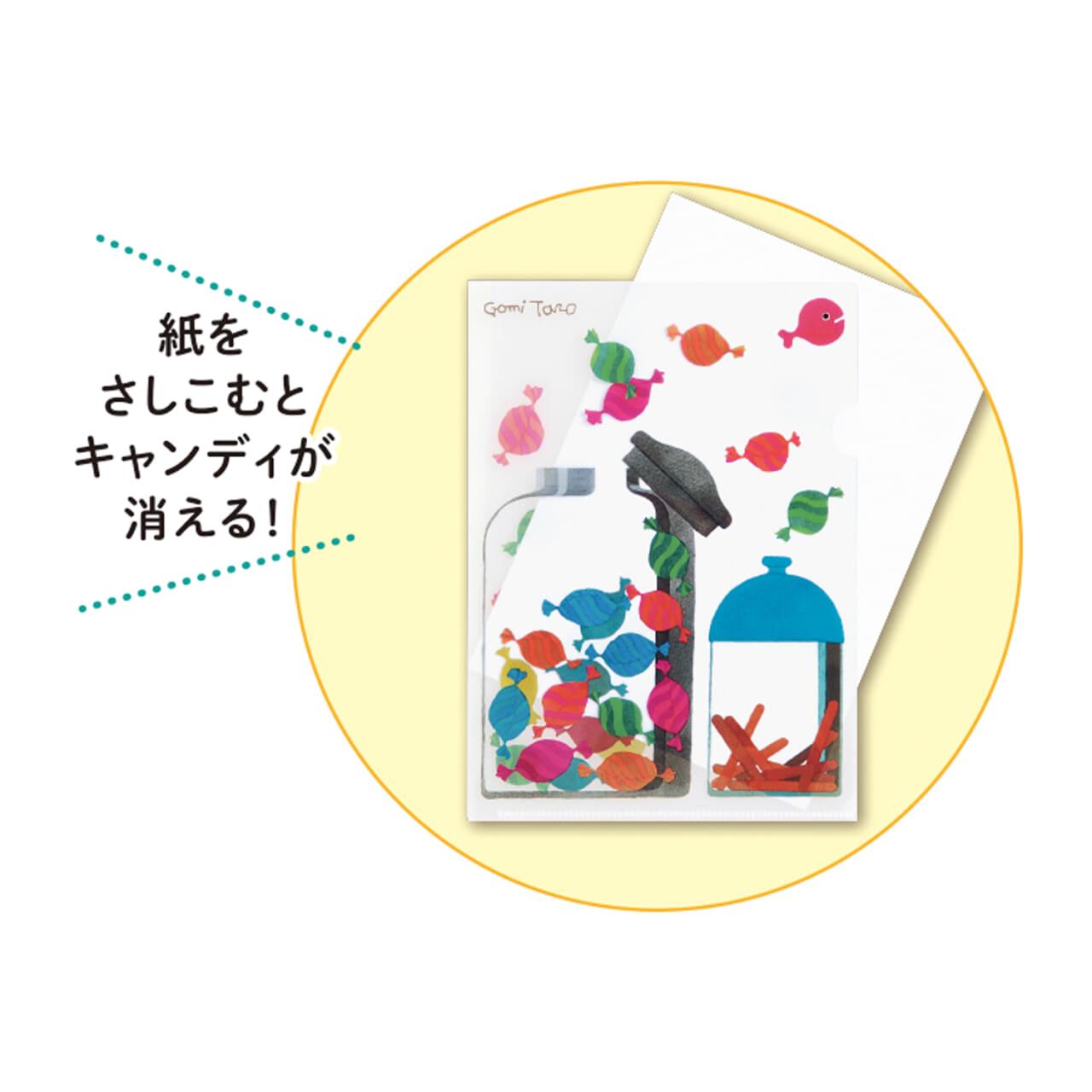 紙をさしこむとキャンディが消える!何も入れない時と、紙を入れた時、デザインが変わる、たのしいA5サイズのクリアファイルです。チケットやDMなどちょっと入れて持ち歩くのにもとっても便利。