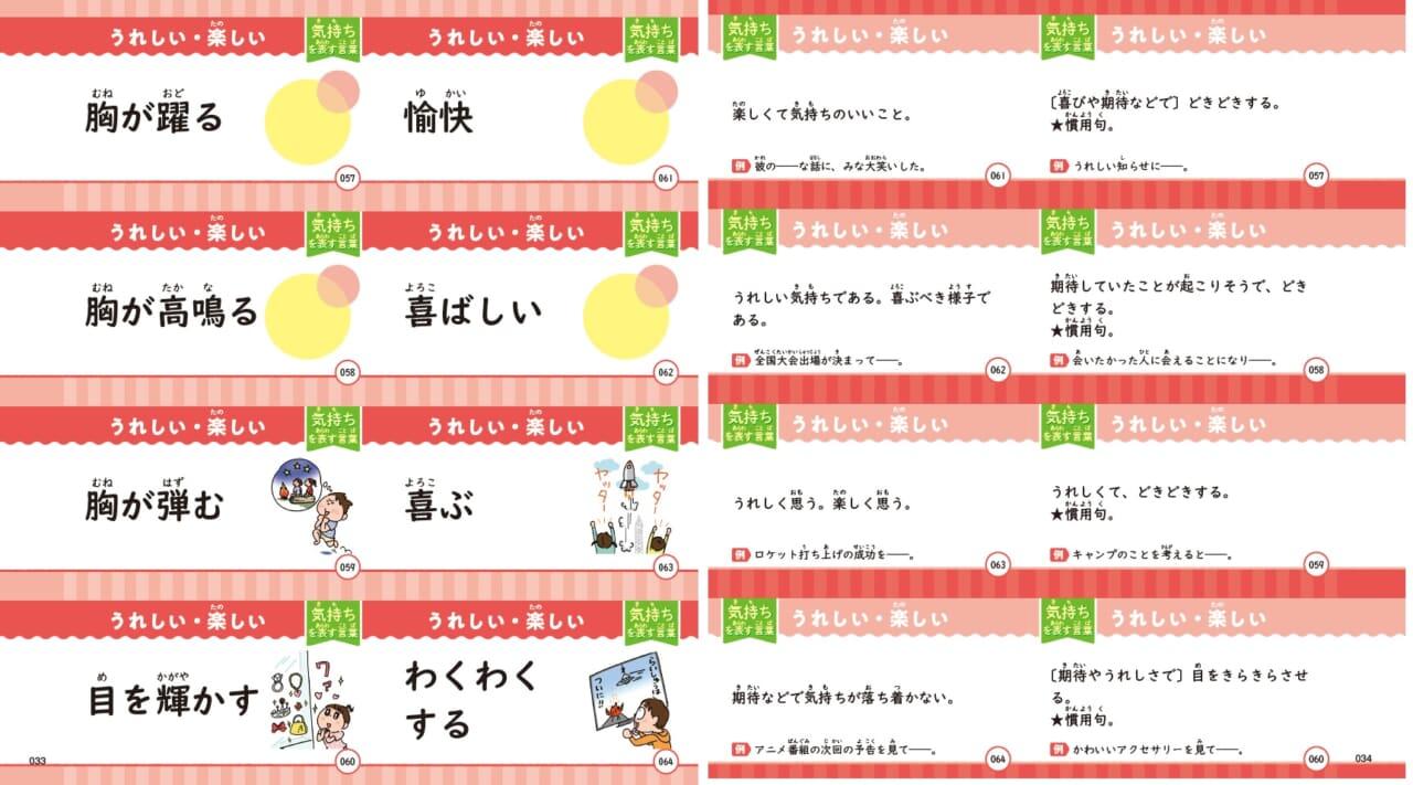 その4分類の中に、「うれしい・楽しい」「がんばる」「笑う」「感動」「緊張」などのキーワードが全59あり、それぞれ、キーワードに関係する言葉や似た意味の言葉が集めてあります。