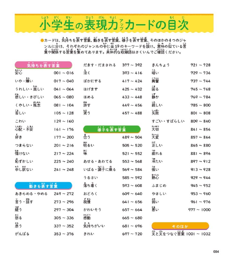 そんな人のために、『小学生の表現力アップカード1000』は文章表現に使える言葉を全1032枚のカードにしました。