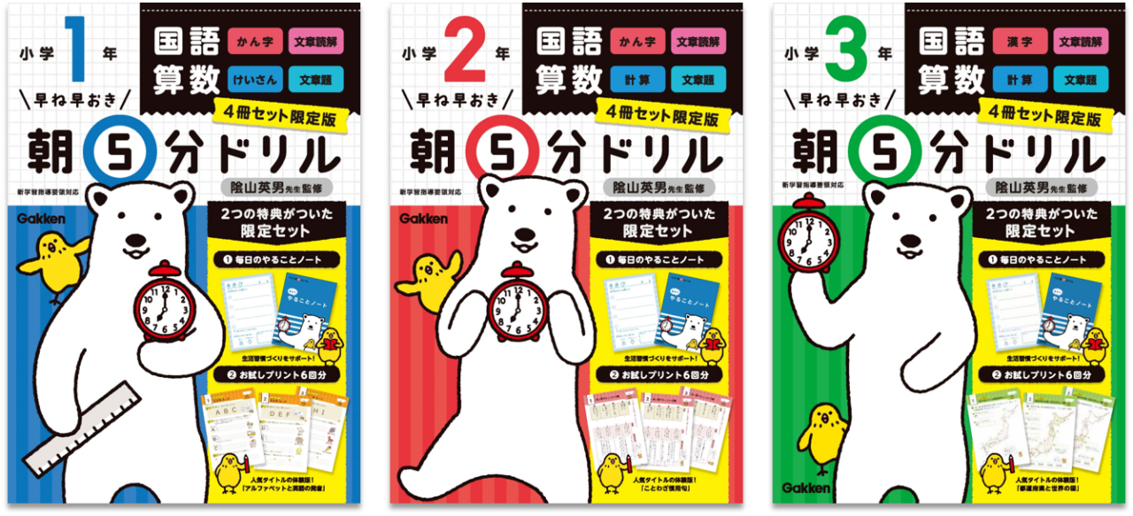 株式会社 学研ホールディングス(東京・品川/代表取締役社長:宮原博昭)のグループ会社、株式会社 学研プラス(東京・品川/代表取締役社長兼COO:南條達也)発行の『早ね早おき朝5分ドリル小学1年4冊セット限定版』(同2・3年)が、大好評により増刷決定! 7月上旬より、全国書店にて発売を開始いたします。