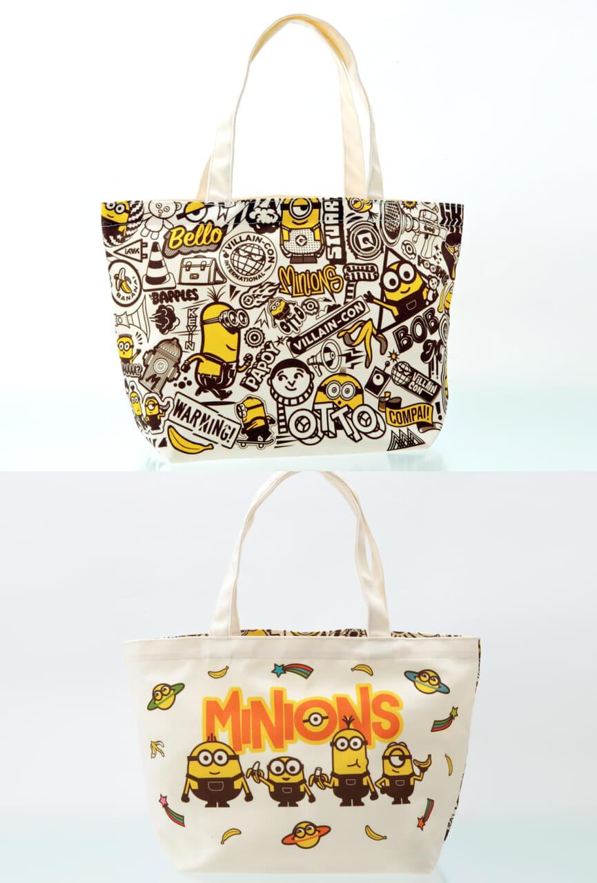 - トートバッグはおしゃれな総柄と、バナナを食べるミニオンたちの絵柄の、両面で2つのデザインが楽しめます。