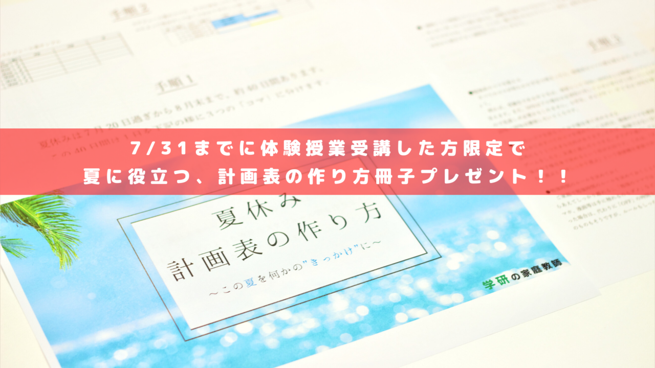 夏休みという貴重な時間を無駄にしてほしくないという想いを込めて、7月31日までに体験授業をご受講頂いた方限定で、夏に役立つ「夏休み 計画表の作り方冊子」をプレゼントいたします!!(ご入会されるかどうかに関わらずプレゼント!)是非、この機会にご検討ください!