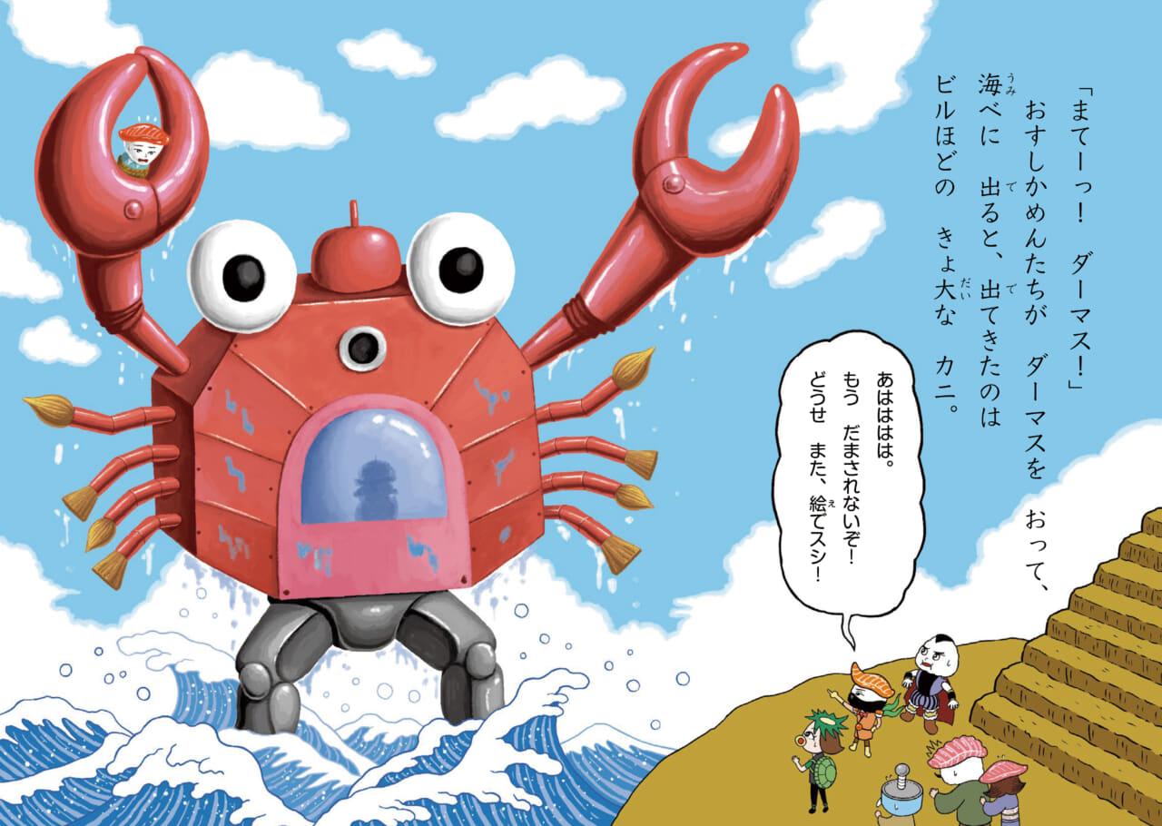 おすしの頭を持った主人公をはじめ、かっぱのマッキーや巨大なカニロボットなど、魅力的なキャラクターが多数登場。