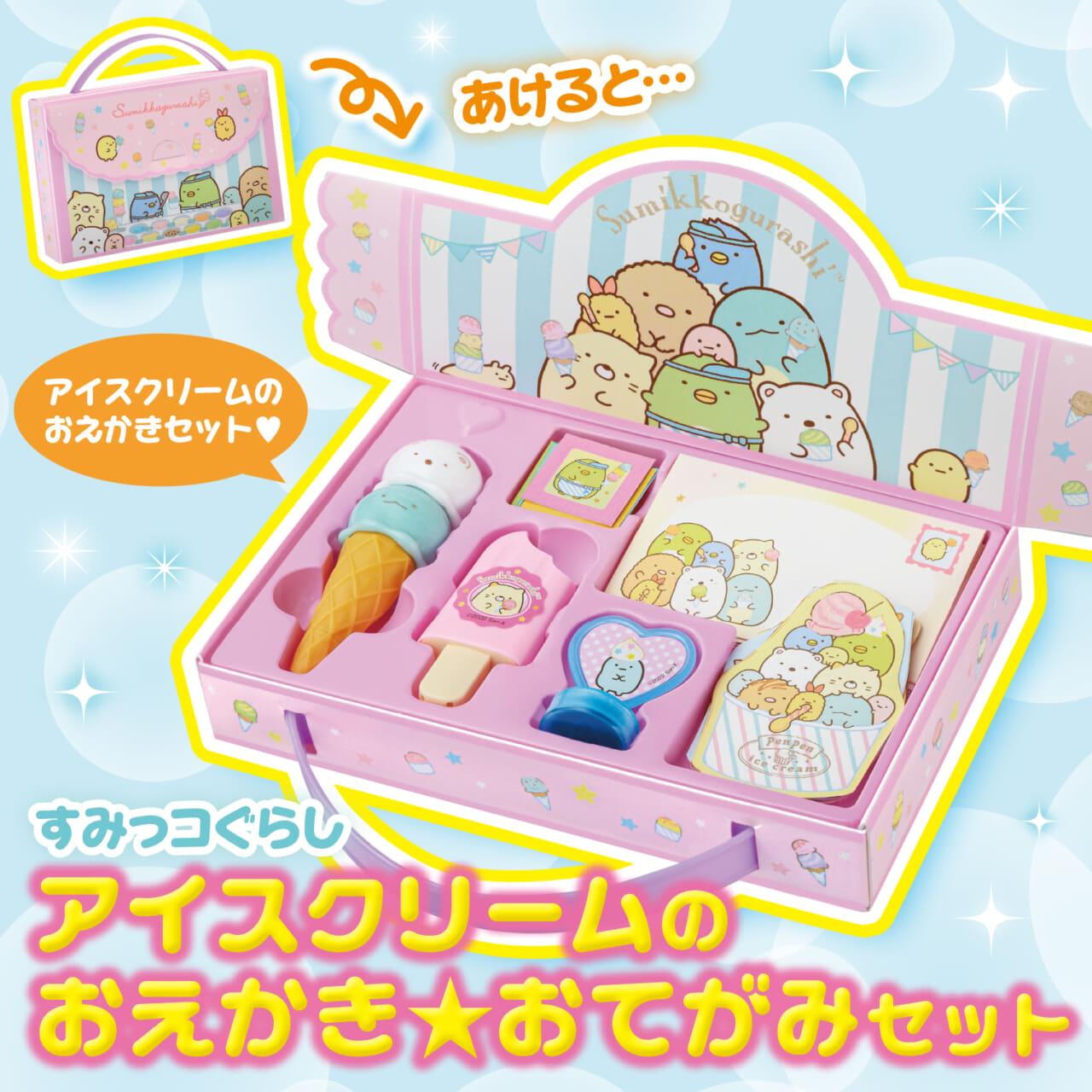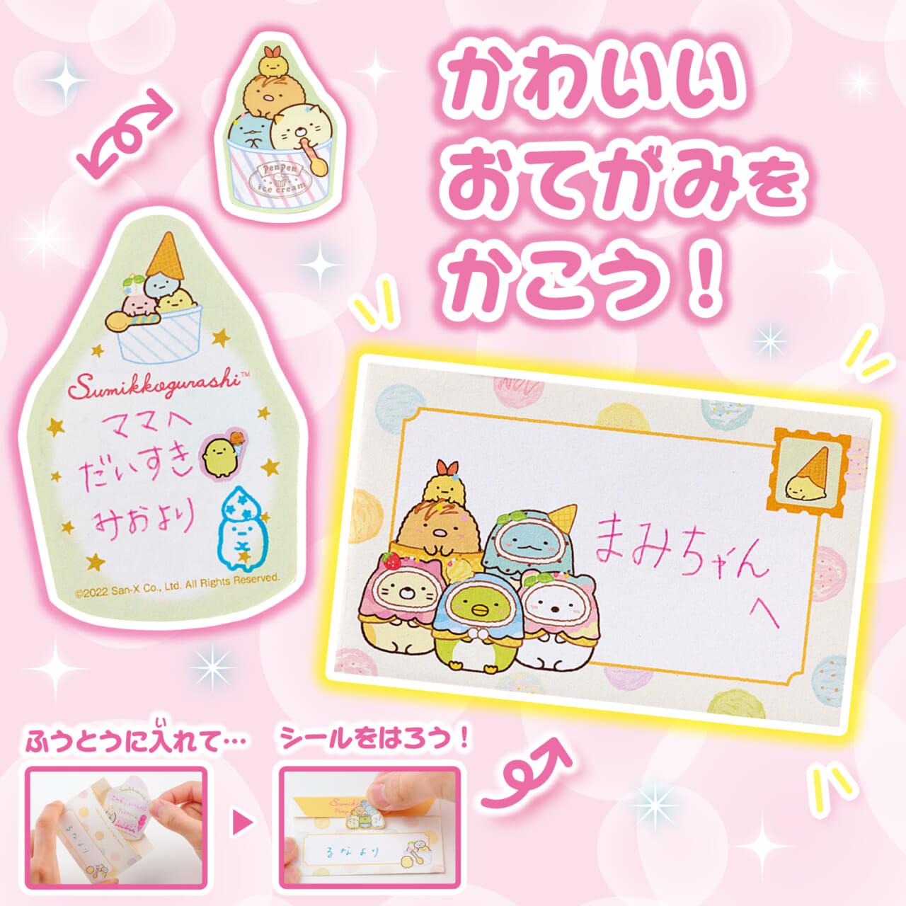 バッグを開けて組み立てると、アイスクリームがテーマのおえかき&おてがみセットがいっぱい! しろくま&とかげのアイスクリームがたペン、好きなすみっコのシールを貼れるアイスキャンディがたペン、たぴおかがかわいいスタンプ、おてがみがたっぷりかけるメモ・ふうとう・シールと、豪華アイテムがたっぷり入ったセットです。