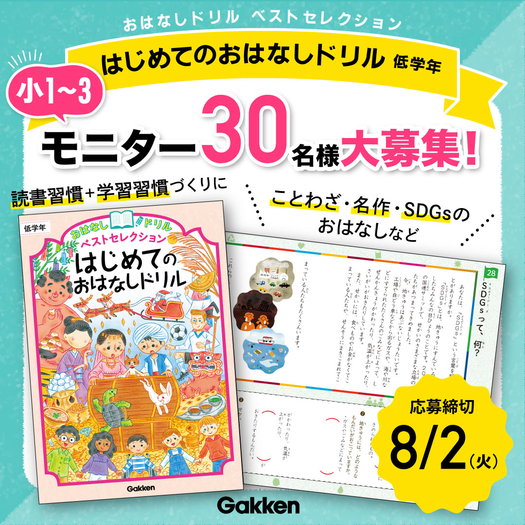 株式会社 学研ホールディングス(東京・品川/代表取締役社長:宮原博昭)のグループ会社、株式会社 学研プラス(東京・品川/代表取締役社長兼COO:南條達也)は、2022年7月28日(木)より、おはなしドリルベストセレクション『はじめてのおはなしドリル 低学年』のモニター様を合計30名募集いたします。募集締め切りは8月2日(火)です。