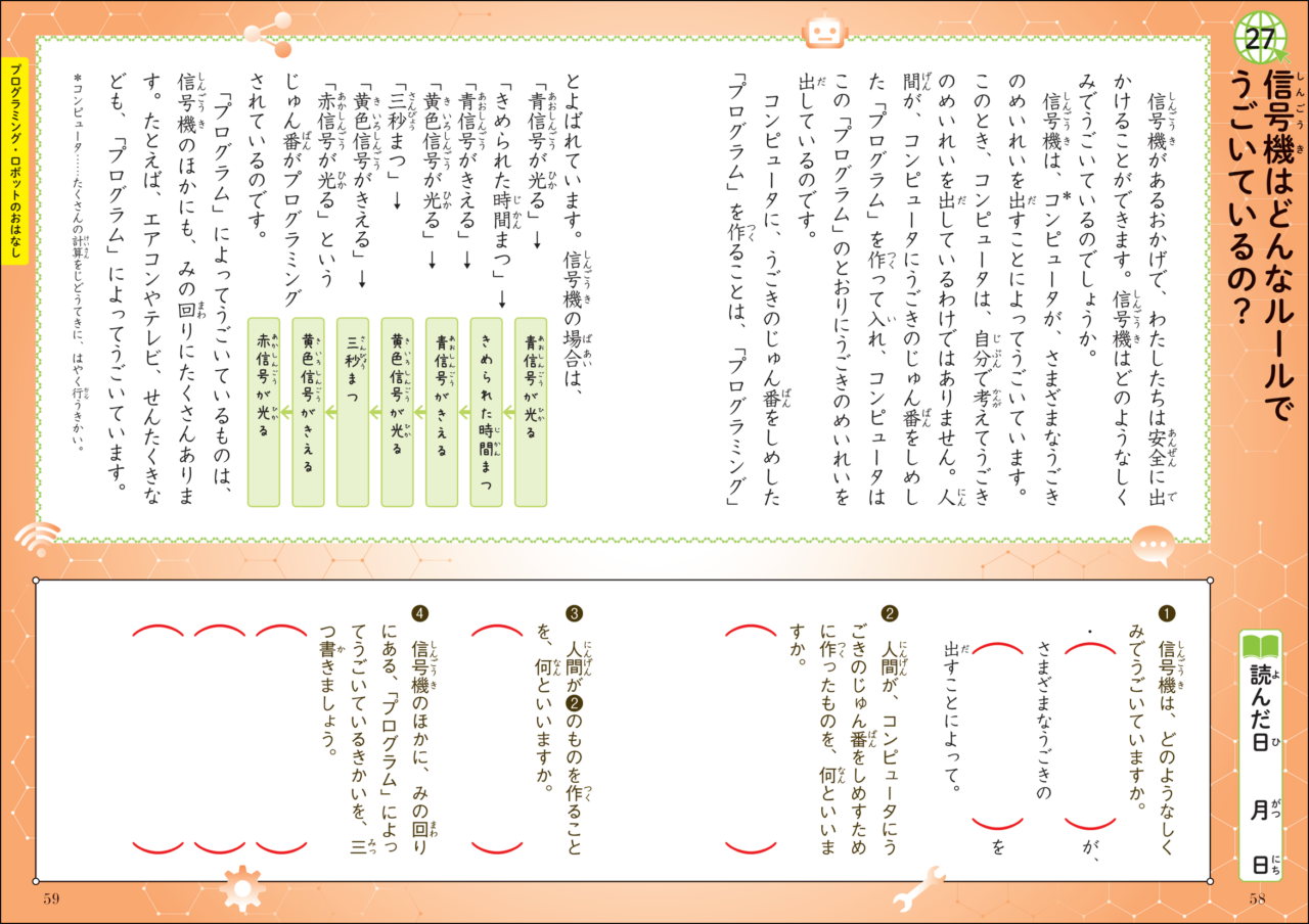 新作の「プログラミング・ロボット」に関するおはなしも4話収録しており、信号機の動くルールやロボットの種類など、私たちの生活を支えるプログラミングやロボットがどのようなものかを学びつつ、読解力をつけることができます。
