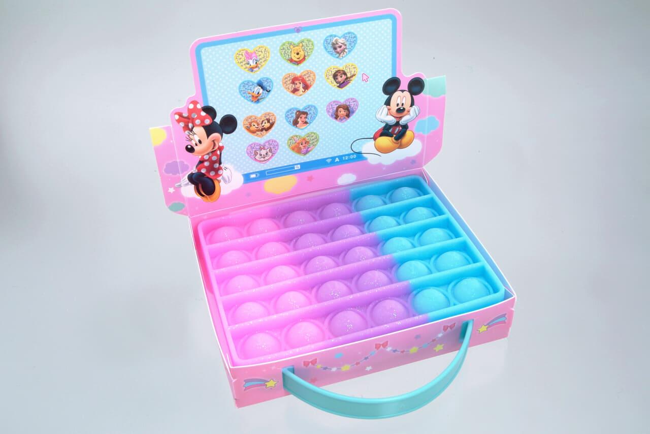 オーロララメが輝くかわいいプッシュポップです。アルファベットつきでケースに入れればまるでパソコンみたい♪ キーボードに見立ててパソコンごっこをしたり、ポコポコ好きなだけ押したり、ゲームで遊んだり、様々な楽しみ方ができます。