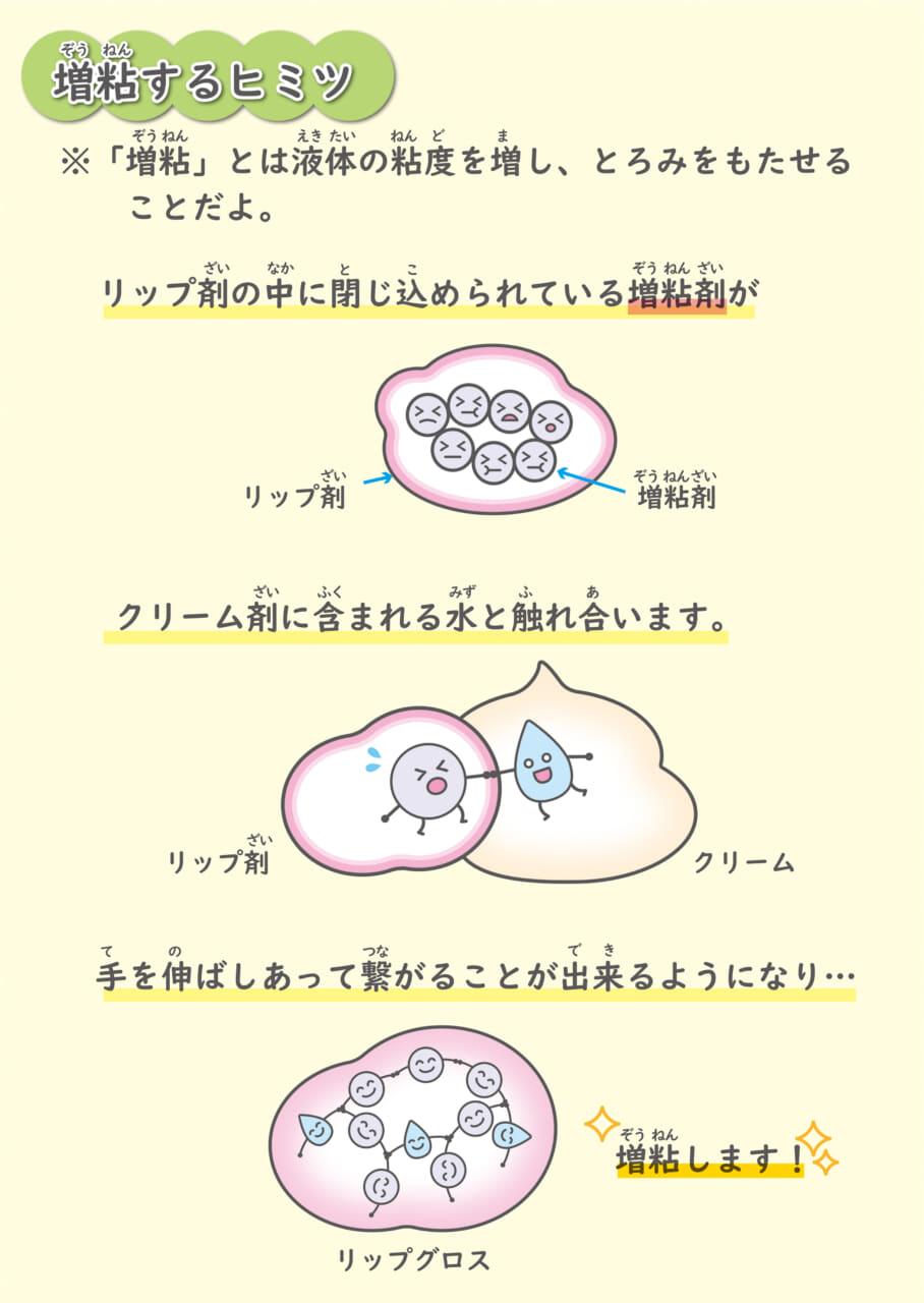 付属の化学反応BOOKでは、クリームのもとを混ぜた時の化学反応、「増粘するヒミツ」や「乳化するヒミツ」など、お勉強になる化学の豆知識もかわいいイラストとともに掲載しています。