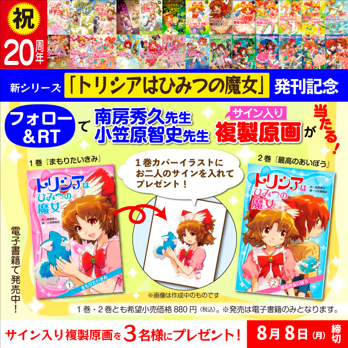 そこで「トリシア」シリーズ20周年と、新シリーズ「トリシアはひみつの魔女」の発刊を記念して、南房秀久先生&小笠原智史先生のサイン入り「トリシア」複製原画が3名様に当たるツイッタープレゼントキャンペーンを実施中です(実施期間:8月1日~8日)。