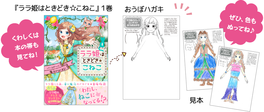 小学生向け児童書新シリーズ『ララ姫はときどき☆こねこ』1巻では、2022年7月14日から“ララ姫のドレスコンテスト”を開催しています。お話の主人公のドレスをデザインして、応募する企画です。