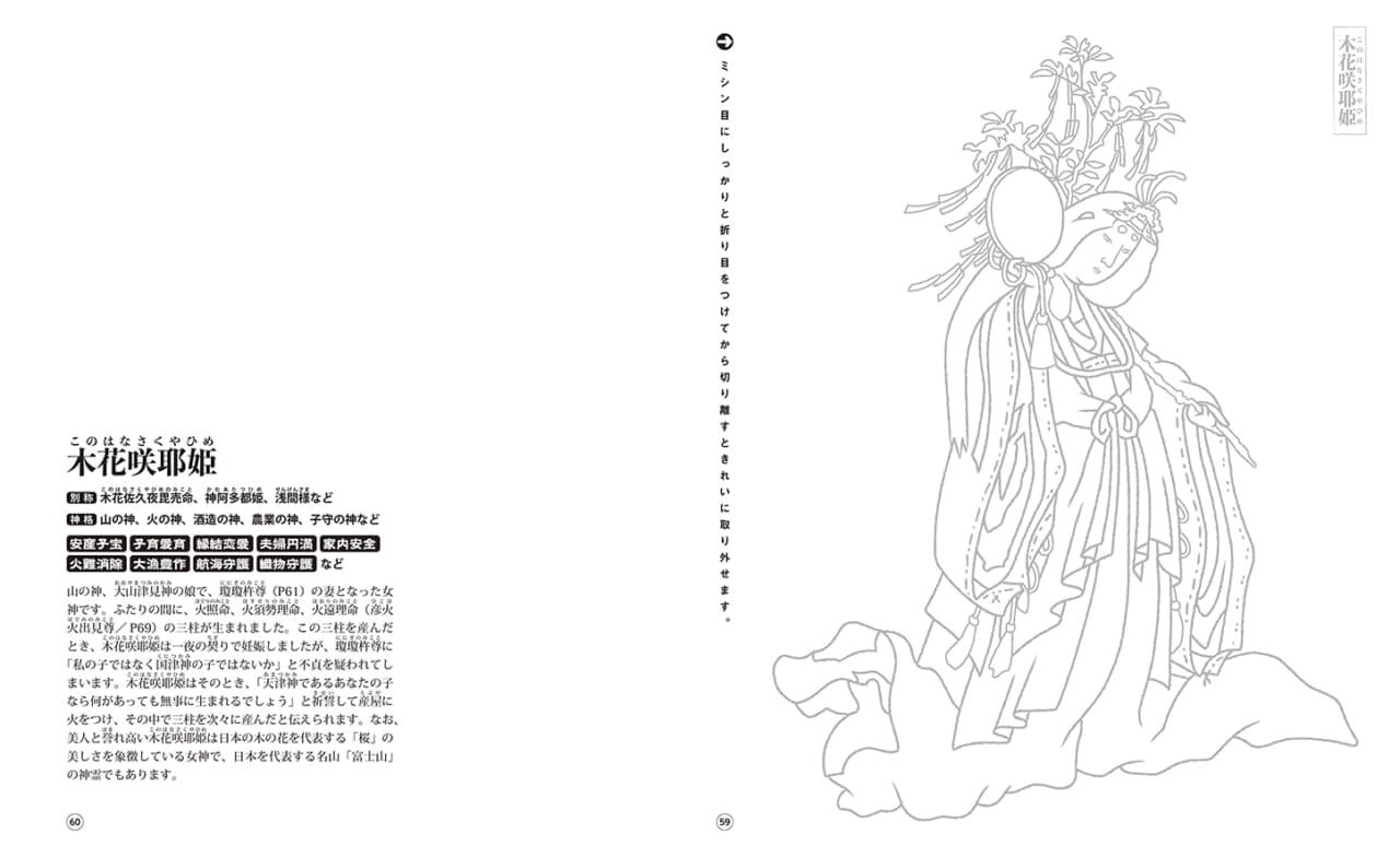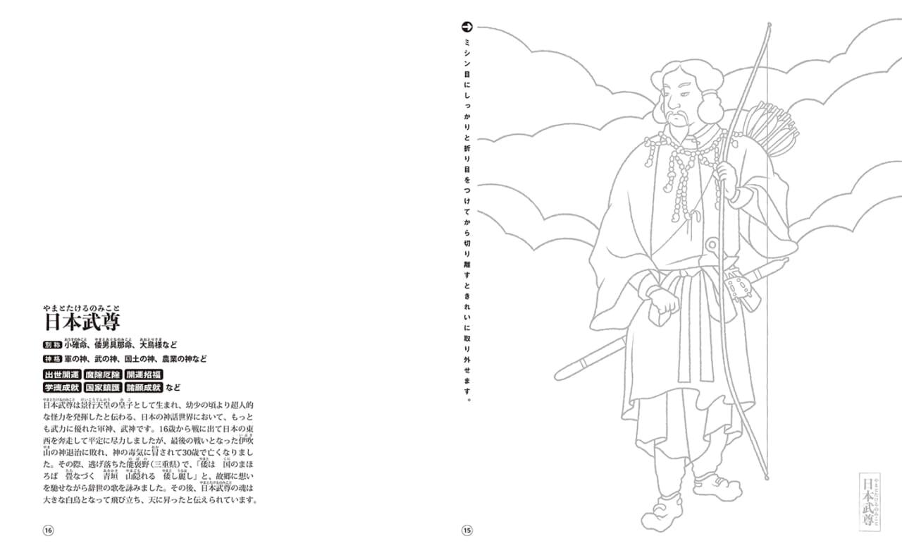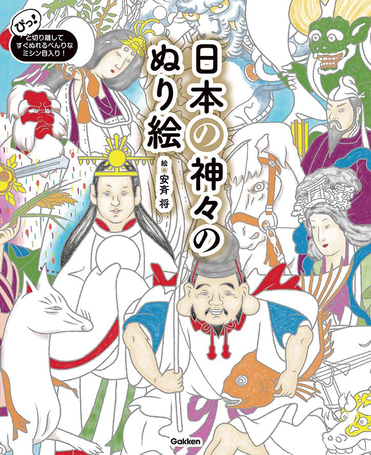 日本には古くから数多くの神が存在するとされ、それらを総称して八百万の神々と呼んできました。八百万は数の800万ではなく、「無数の」「数限りなく」といった意味を表す言葉です。その言葉の通り、日本の神はいたる所に存在し、山の神や海の神、財福の神や学問の神などなど、その特徴は多種多様、千差万別で、とてもユニークでバラエティに富んでいます。そんな日本の神々34柱を宝船のようにして一堂に集め、みなさまの開運招福を願って一冊のぬり絵にしたのが、この『日本の神々のぬり絵』です。