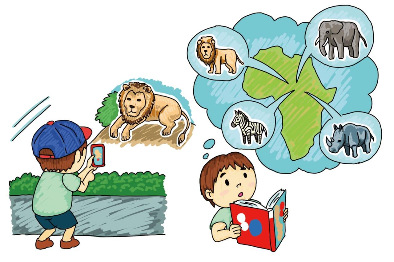 例)ライオンと同じアフリカに分布している動物を、図鑑で探す。
