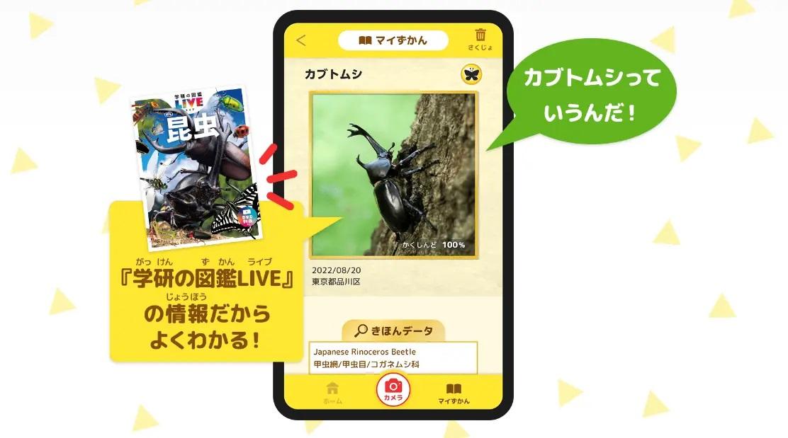 ナニコレンズと図鑑を組み合わせた、1日でできる自由研究をご紹介します! ナニコレンズで撮影した生物を図鑑で調べ、わかったことをまとめれば、それだけで立派な自由研究になります。ナニコレンズは図鑑と相性抜群! お出かけ先で撮影した生物の名前がアプリに記録されるので、家に帰ってからスムーズに図鑑で調べることができます。アプリには、その生物が掲載されている『学研の図鑑LIVE』の対応ページ数も表示されます。