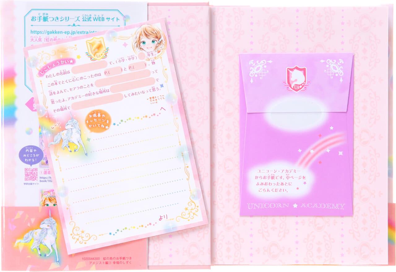 物語を読み終えると、最後のページには、小さな封筒に入ったおとぎの世界からのお手紙が! 主人公やユニコーンにお手紙の返事を書けるお返事用はがきもついていて、おとぎの世界と現実の世界が、魔法のようにつながります。