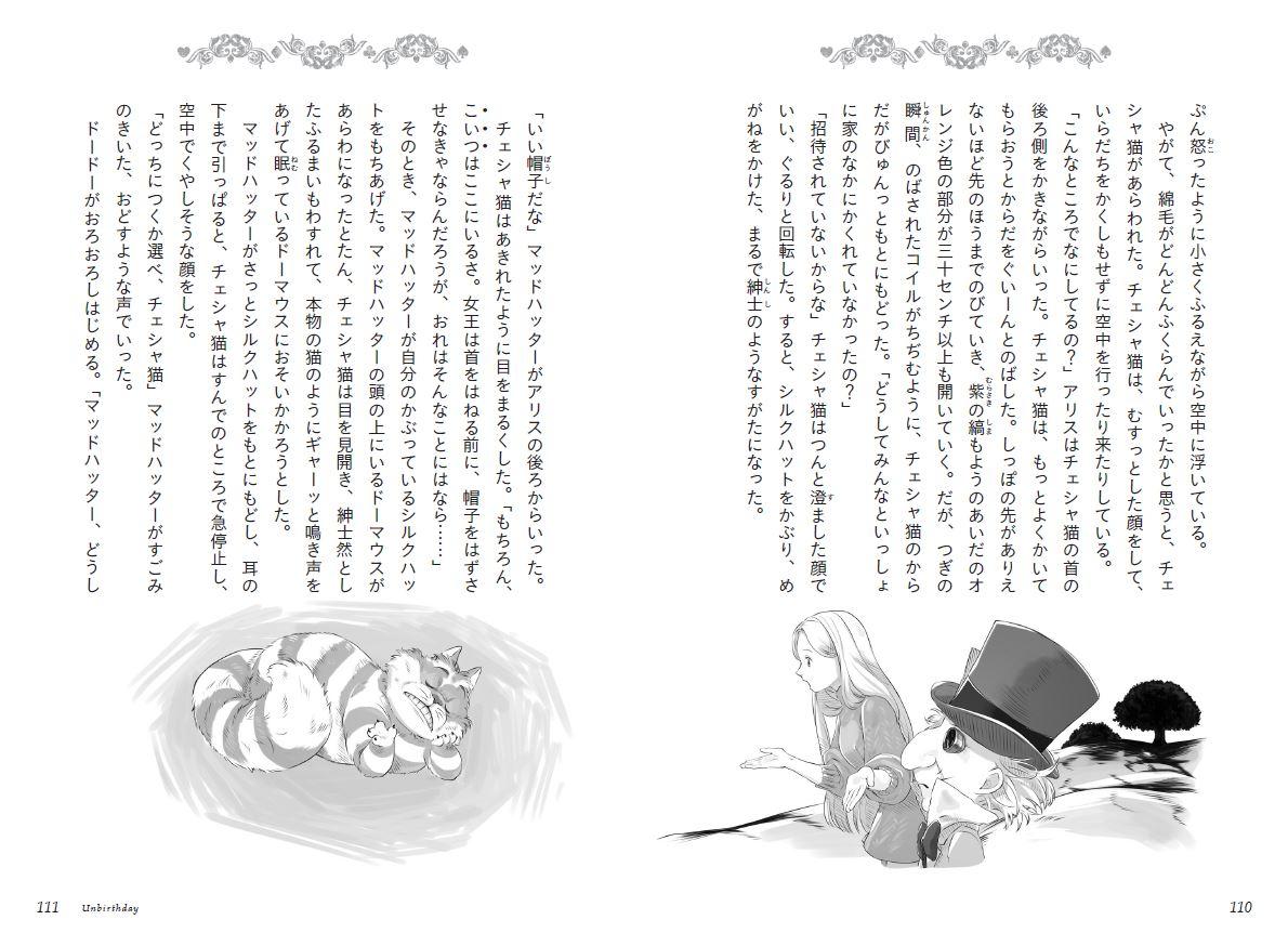 『ふしぎの国のアリス』では7歳だったアリスは自立心のある18歳の女性に成長。持ち前の行動力と好奇心は健在で、19世紀のヴィクトリア朝時代の習慣やしきたり、異文化に対する無理解は彼女にとっては窮屈でナンセンスそのもの。一方、大人になった目で見るワンダーランドも、理解しがたいナンセンスなことだらけ! でも、ここでのナンセンスは不思議と心地よい。この物語ではそんなふたつの世界のナンセンスのちがいを感じながら読むとおもしろい。
