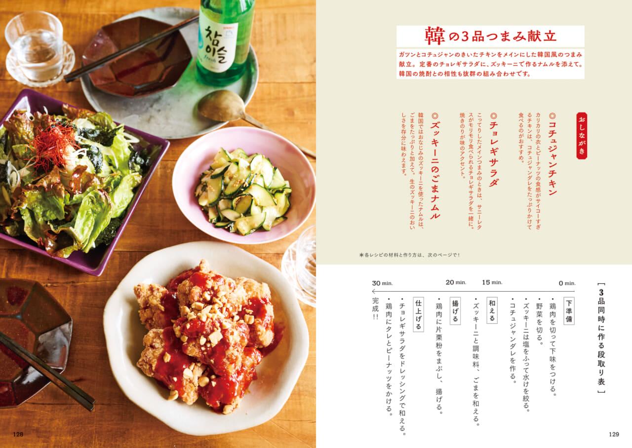 さらにPart3では、「ゆっくり呑みたい日の3品つまみ献立」と題し、週末など、ちょっと時間がある日に楽しみながら作りたいおつまみレシピを、3品の献立形式でご紹介しています。和風、洋風、中華風、韓国風、エスニック風のテーマ別なので、その日の気分に合わせて選べます。また、3品同時に効率よく作れる段取り表付きなので、何なら呑みながらでも作れちゃいます!
