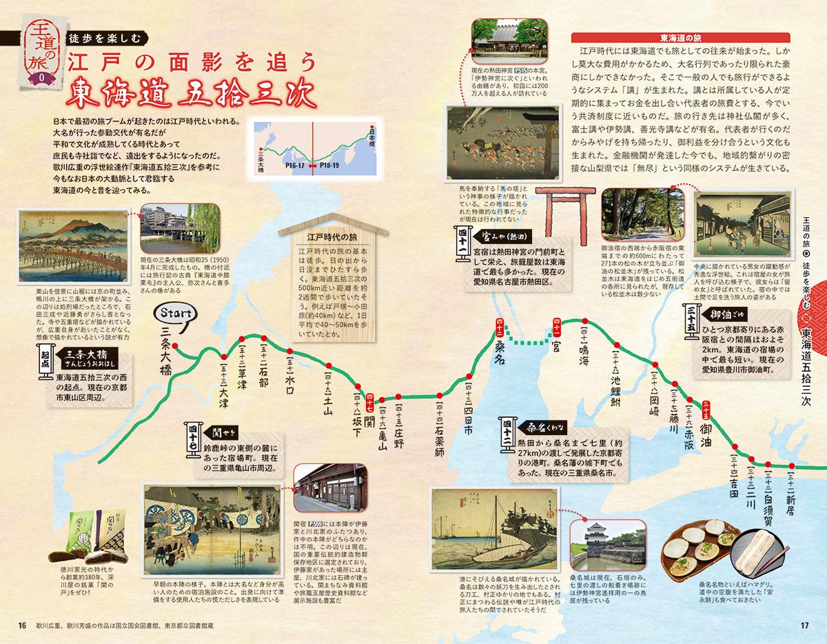 日本全国を掲載する本書だからこそ紹介できる縦断企画がこちら。歌川広重の浮世絵とともに、東海道の今と昔をたどることができる「東海道五拾三次」や、日本を縦断する「西大山から稚内へ」は16泊17日ものガチプランをご提案。どちらも完コピできる方求む!?