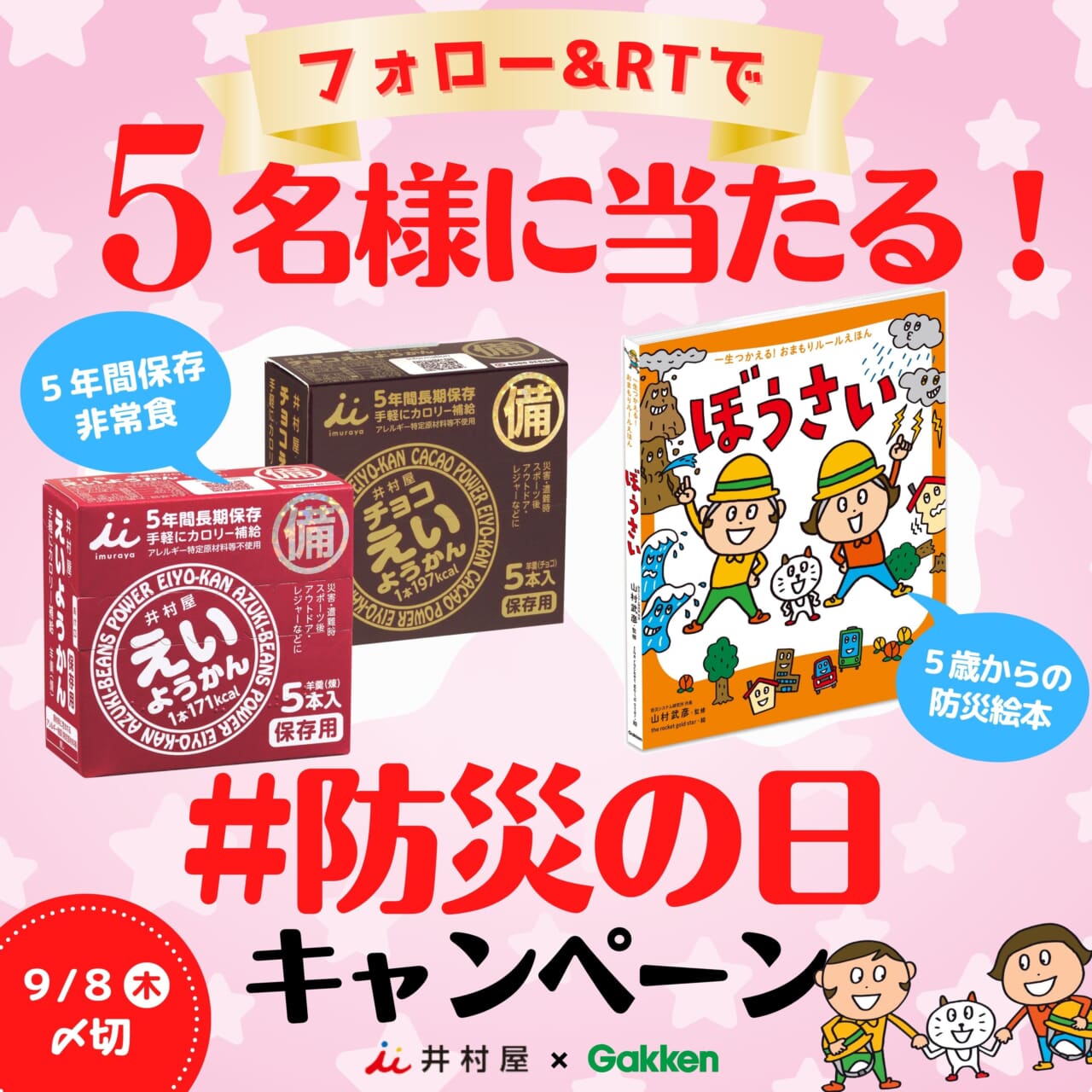 「あずきバー」でおなじみの井村屋と、学研プラスのコラボレーションが実現。9月1日の防災の日にちなんで、非常食にぴったりの『えいようかん』『チョコえいようかん』と、書籍『おまもりルールえほん ぼうさい』のセットが抽選でもらえるプレゼントキャンペーンを実施中です。
