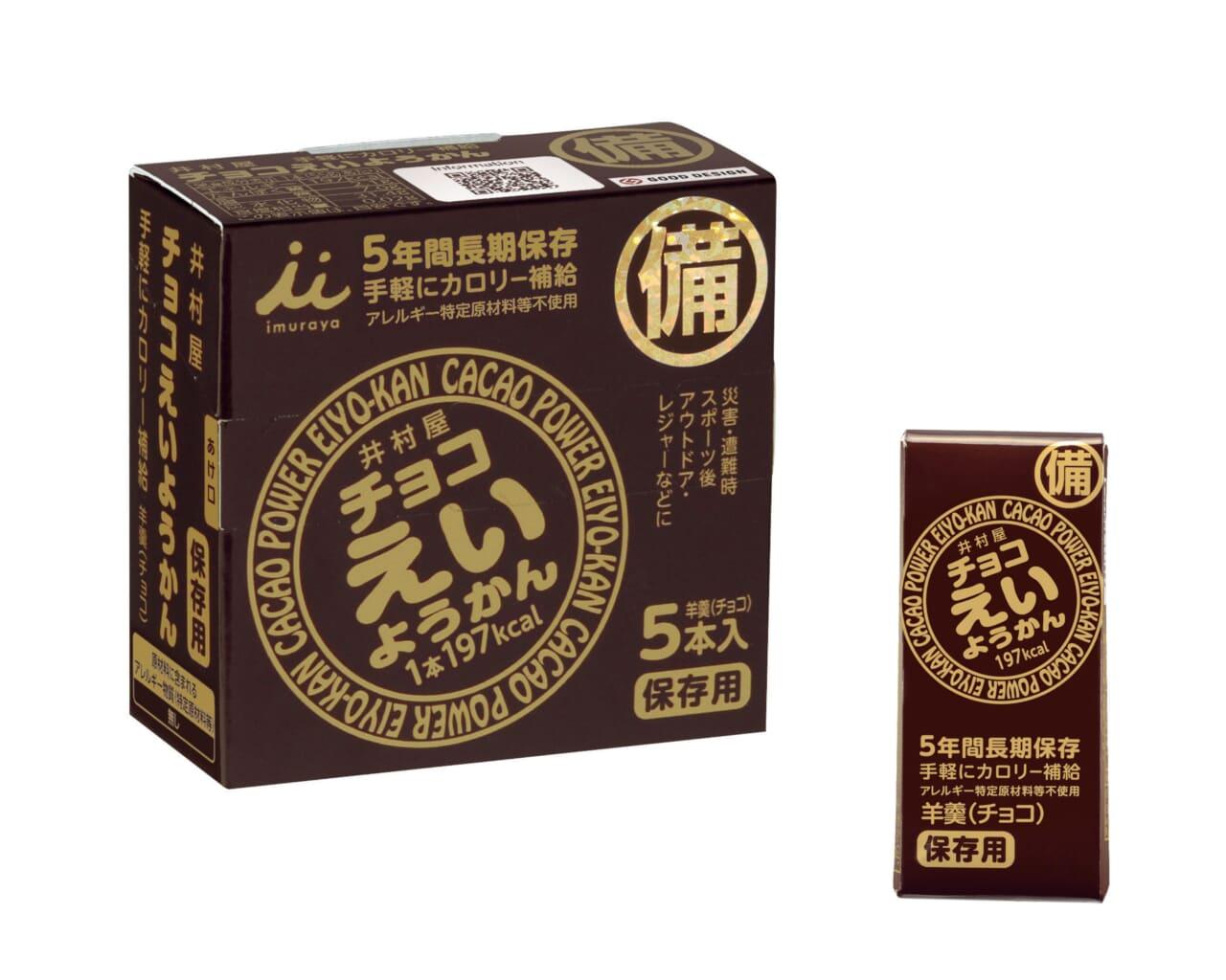 おいしくて、5年間の長期保存が可能な「えいようかん」。水なしでも食べやすく、手軽にカロリー補給ができる、非常食にぴったりの食品です。非常持ち出し袋に入れやすいサイズの箱に、ハサミが無くてもあけられる個包装のミニようかんが5本入り。