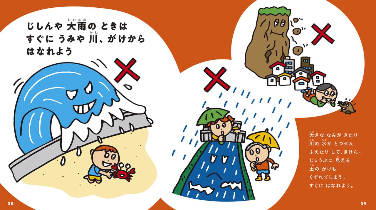 災害から身を守るためのルールをやさしく教える絵本。防災の心構えや、災害が起きたときにとるべき行動など、35の防災ルールを紹介しています。巻末には、非常持ち出し袋に入れるものリストや、災害用伝言ダイヤルの使い方など、お役立ち情報も満載。