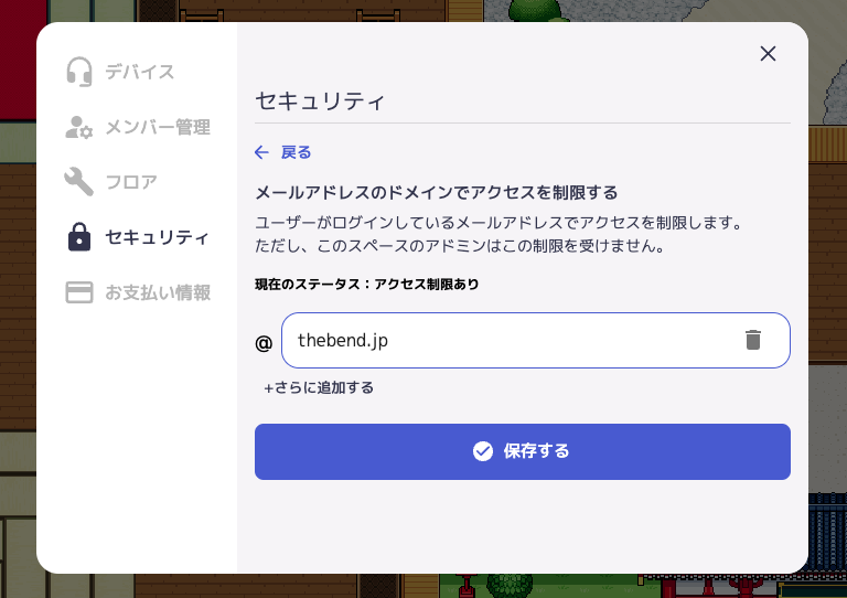 ご利用中のスペースに「アクセスを許可するドメイン」を設定することで、そのドメイン以外のメールアドレスでサインインしているユーザーはスペースに入ることができなくなります。ドメインは複数個設定することも可能です。