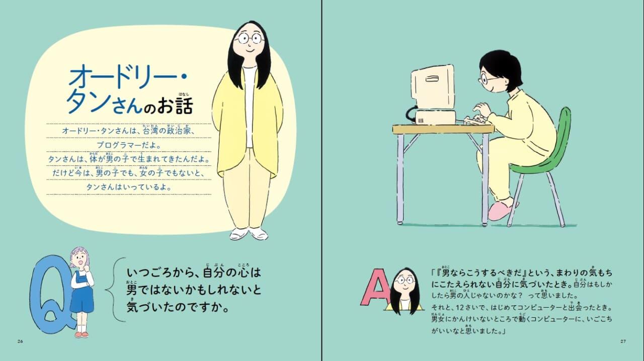 一般の方、オードリー・タンさん、杉山文野さん、ロバート キャンベルさんにインタビューした内容を、わかりやすくまとめ、絵本化したものです。