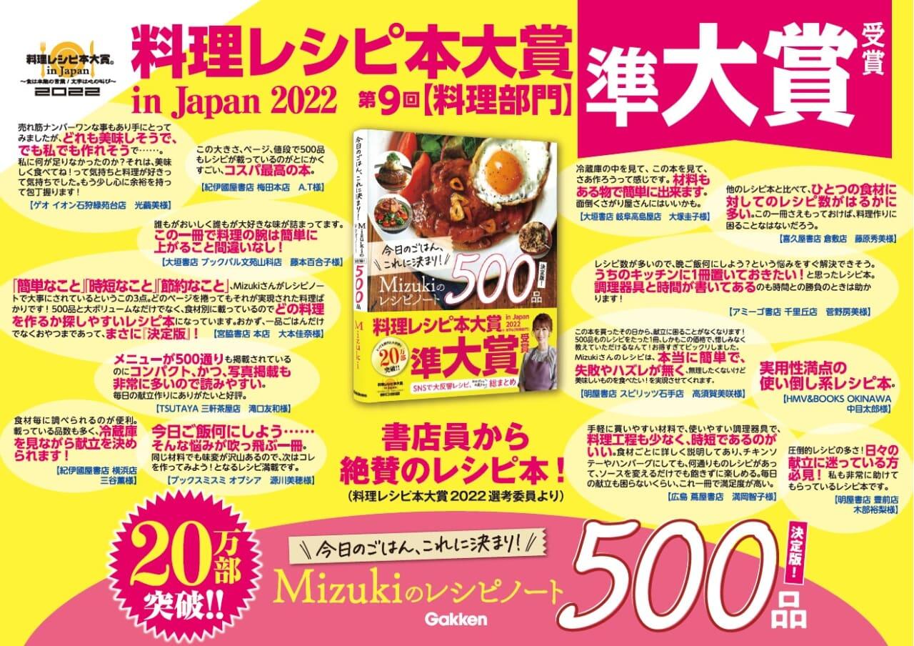 株式会社 学研ホールディングス(東京・品川/代表取締役社長:宮原博昭)のグループ会社、株式会社 学研プラス(東京・品川/代表取締役社長兼COO:南條達也)発行の『今日のごはん、これに決まり!Mizukiのレシピノート決定版!500品』(著:Mizuki)が、「2022年度 第9回料理レシピ本大賞 in Japan」において、[料理部門]の「準大賞」を受賞しました。
