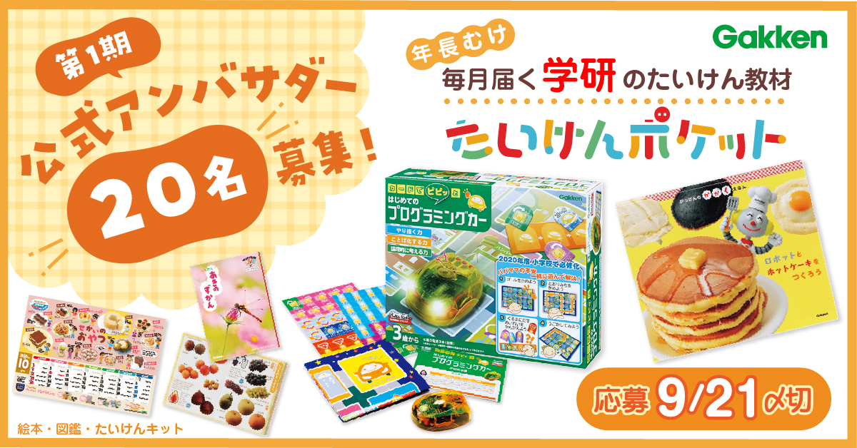 株式会社 学研ホールディングス(東京・品川/代表取締役社長:宮原博昭)のグループ会社、株式会社 学研プラス(東京・品川/代表取締役社長兼COO:南條達也)は、2022年9月12日(月)に5・6歳(年長)向けのサービス『たいけんポケット』の第1期公式アンバサダー募集を開始いたします。応募締め切りは9月21日(水)です。