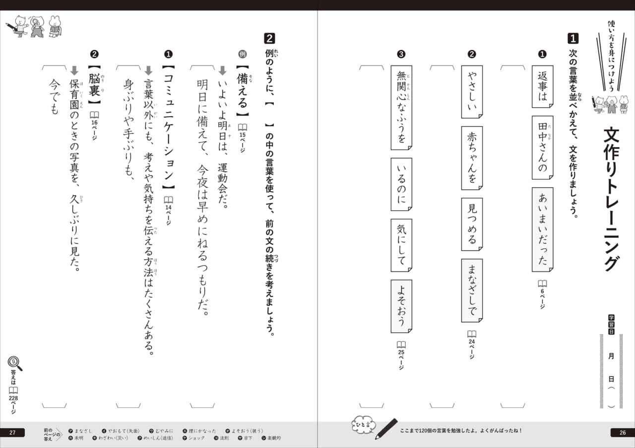 言葉の本というと、漫画などで楽しく学べるものも多いですね。楽しく学べることはいいことですが、読むだけで本当に語彙力がつくのかな、と不安になる方もいるかもしれません。本書には、「穴埋め問題」「文作りトレーニング」という「書く」ための2つのステップがあります。下段の穴埋め問題で知識を確認し、身につけることができたら、文作りトレーニングで身につけた知識を使ってみましょう。実際に「使う」場面を意識しながら学ぶことにより、「言葉力」が向上します。