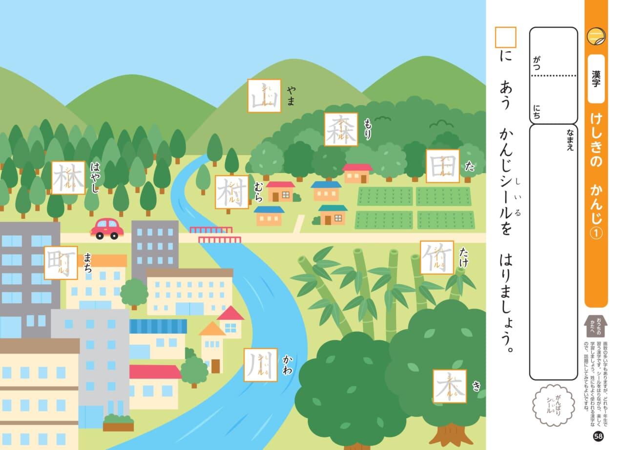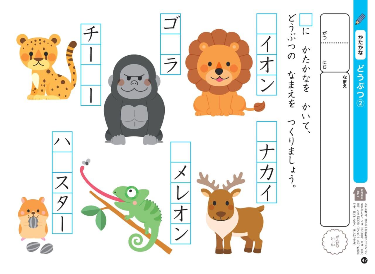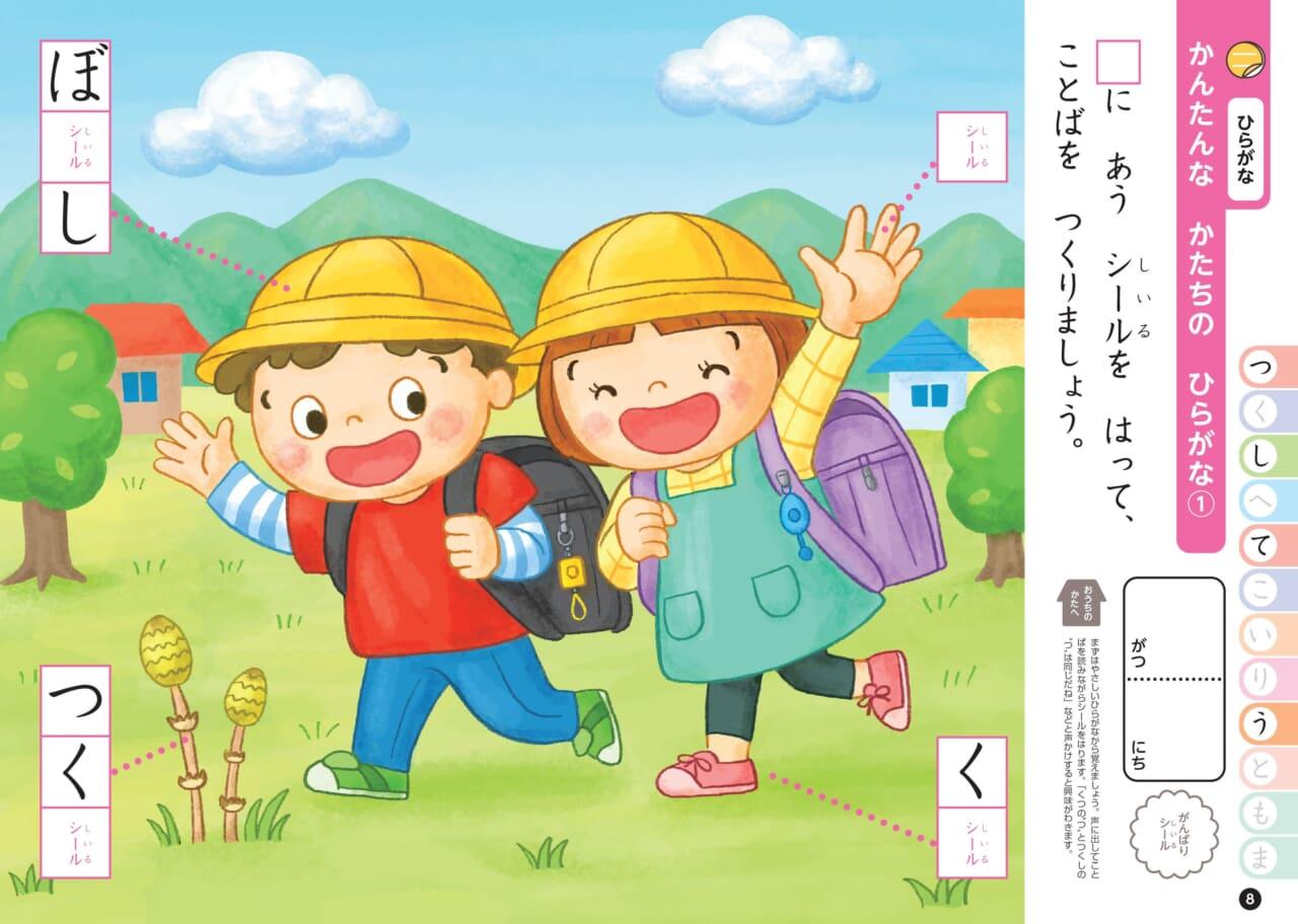 ひらがなとかたかなの違いをよく見比べます。「まち」「スポーツ」などかたかなのことばが多く登場する場面別に、シールをはったりなぞったりして学習します。