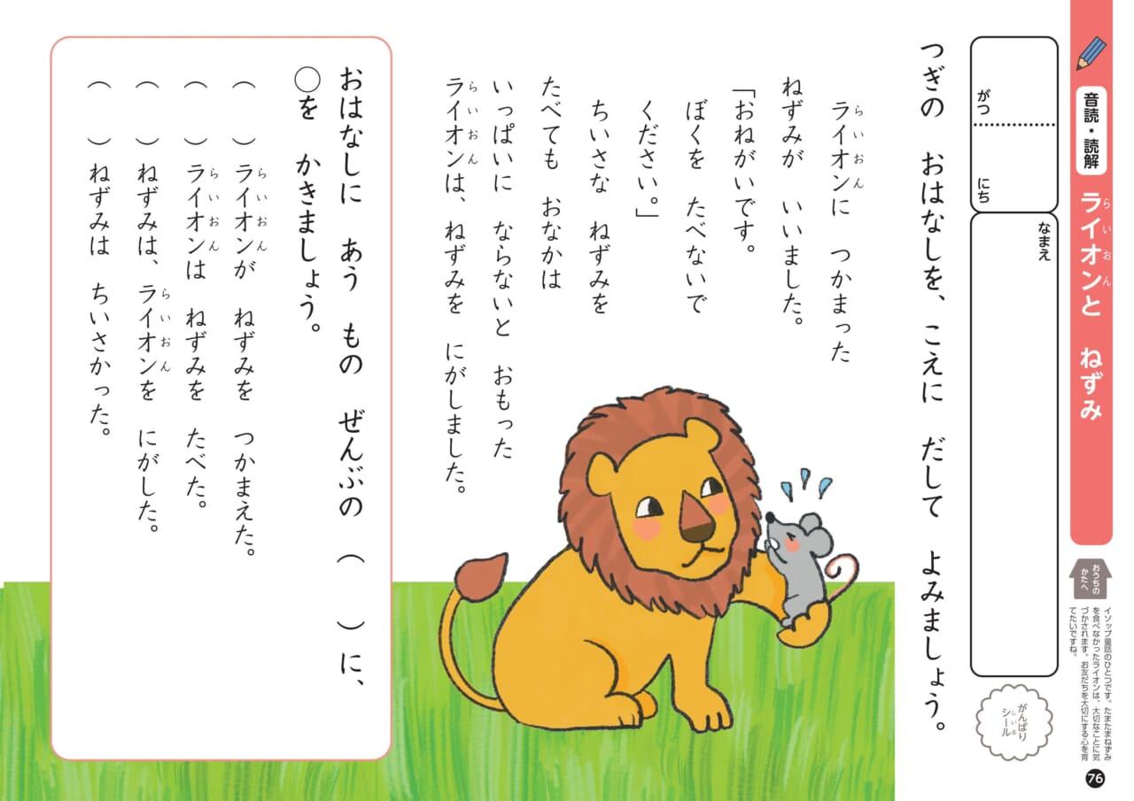 お話を声に出して読み、問題に答えます。入学後、音読は毎日のように宿題にもなるため、楽しみながら触れることで、入学後の自信につながります。