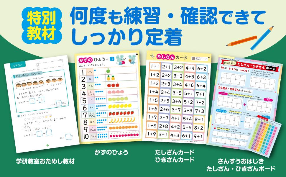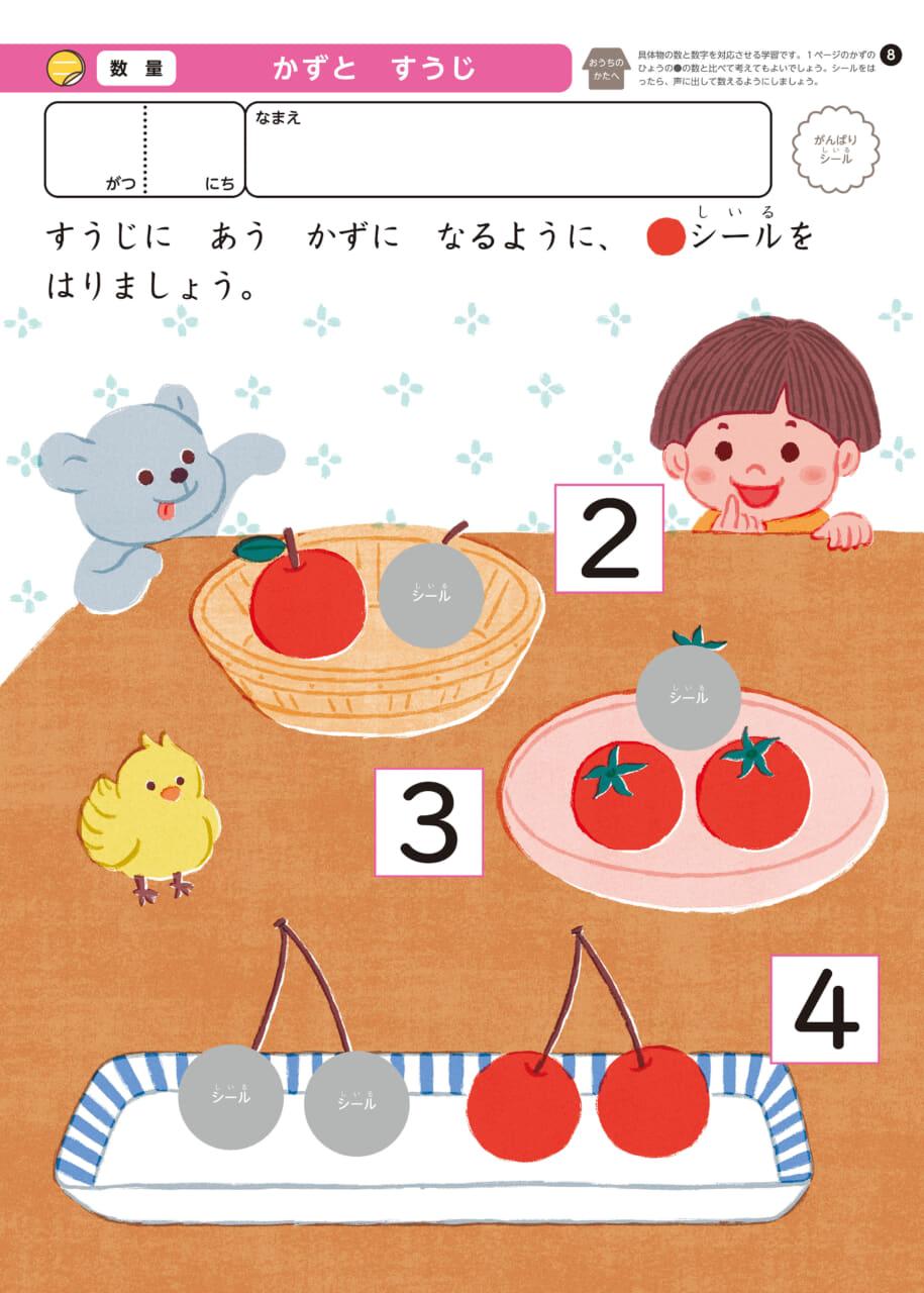 「かず」と「すうじ」の関係、多い・少ないなどの数量の理解、かずの並び(数系列)、かずの分解(いくつといくつ)など、たしざん・ひきざんにつながる基礎を定着させます。