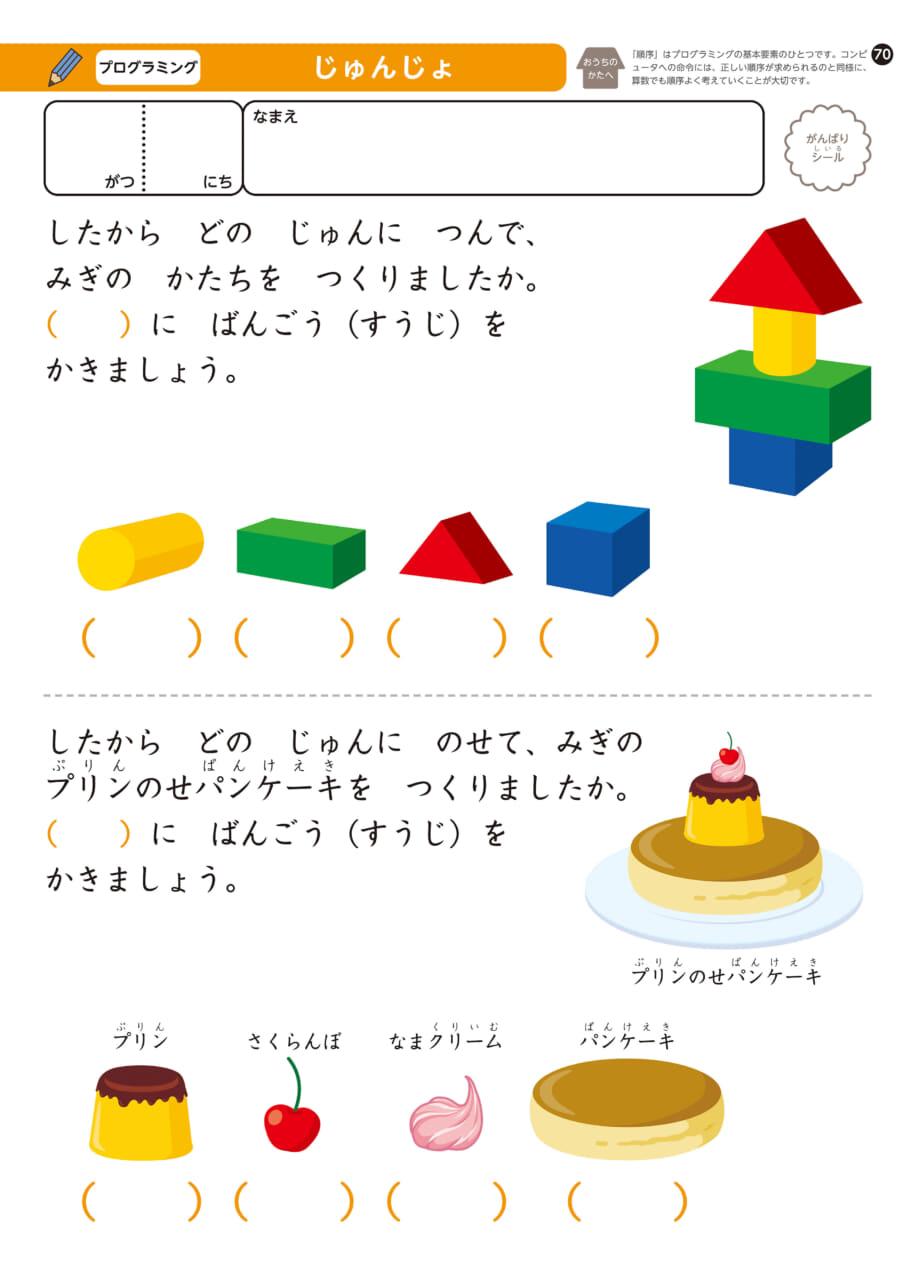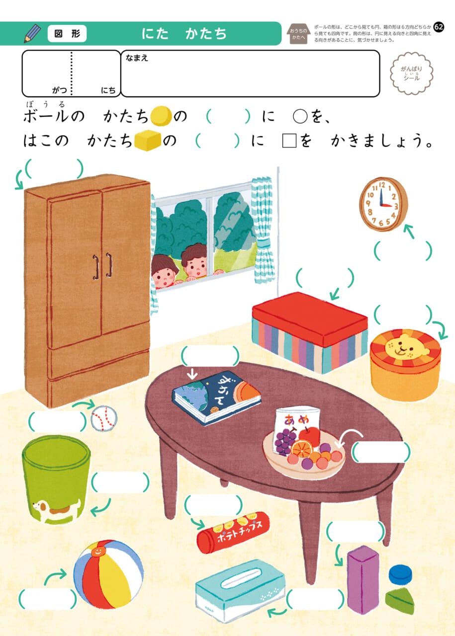 長さ・面積・量の比較(どれが一番大きい)、形の認識など、わかりやすいイラストをヒントに楽しく取り組みます。