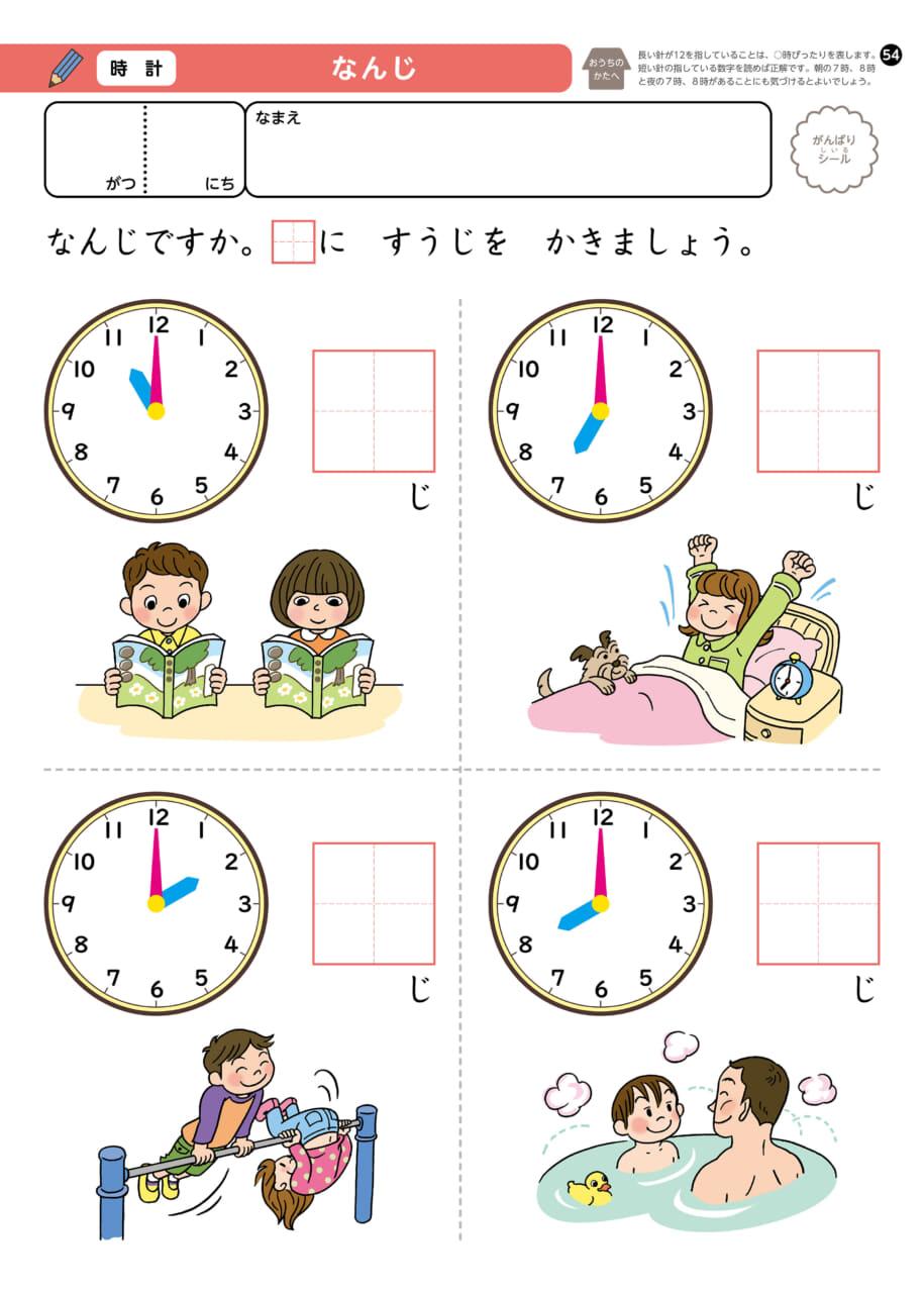 短針・長針の役割を意識し、「なんじ」「なんじはん」が読めるように練習します。入学前に時計に慣れ親しむことは、小学校での時間割やルールの理解につながります。