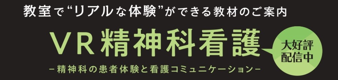 “精神科看護の実際”を、VRの特性を活かしてリアルに体験できる動画と、動画を使用した効果的な授業をすぐに展開できる教員用授業の手引き、学生用ワークブック、スマホ用VRゴーグルがセットとなった『精神看護学唯一の体験型教材』です。