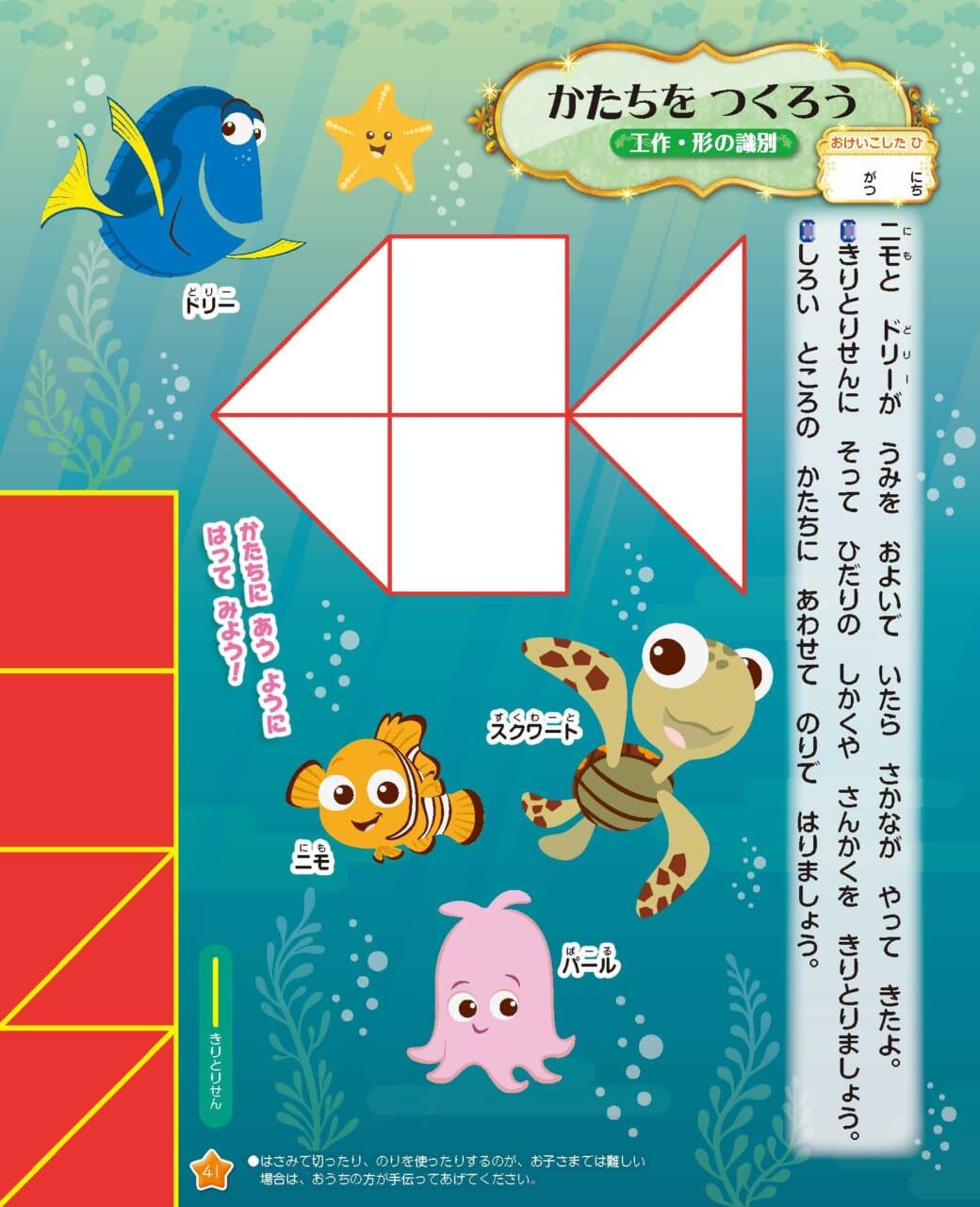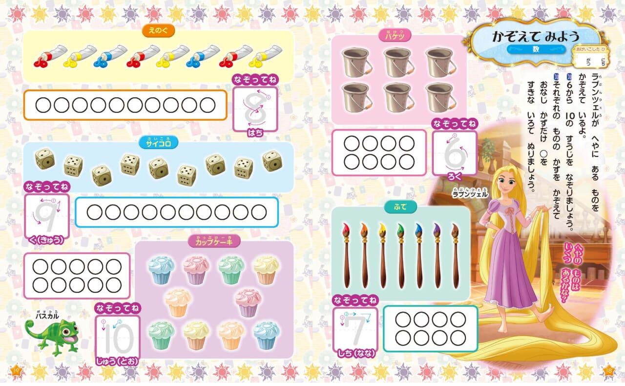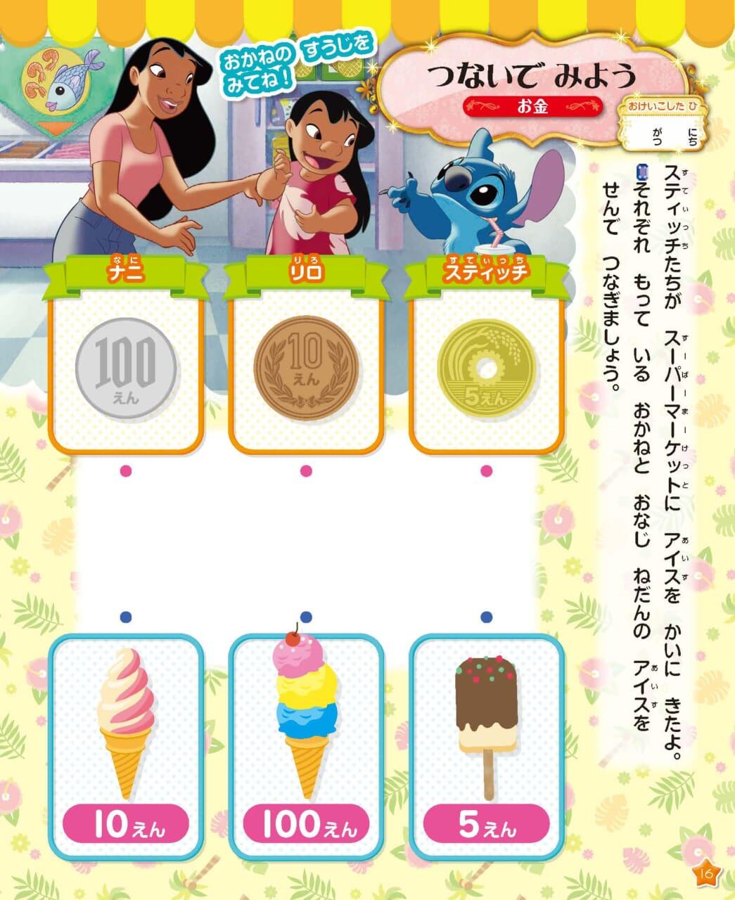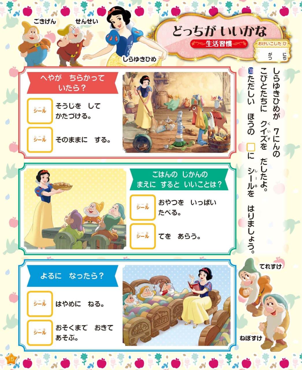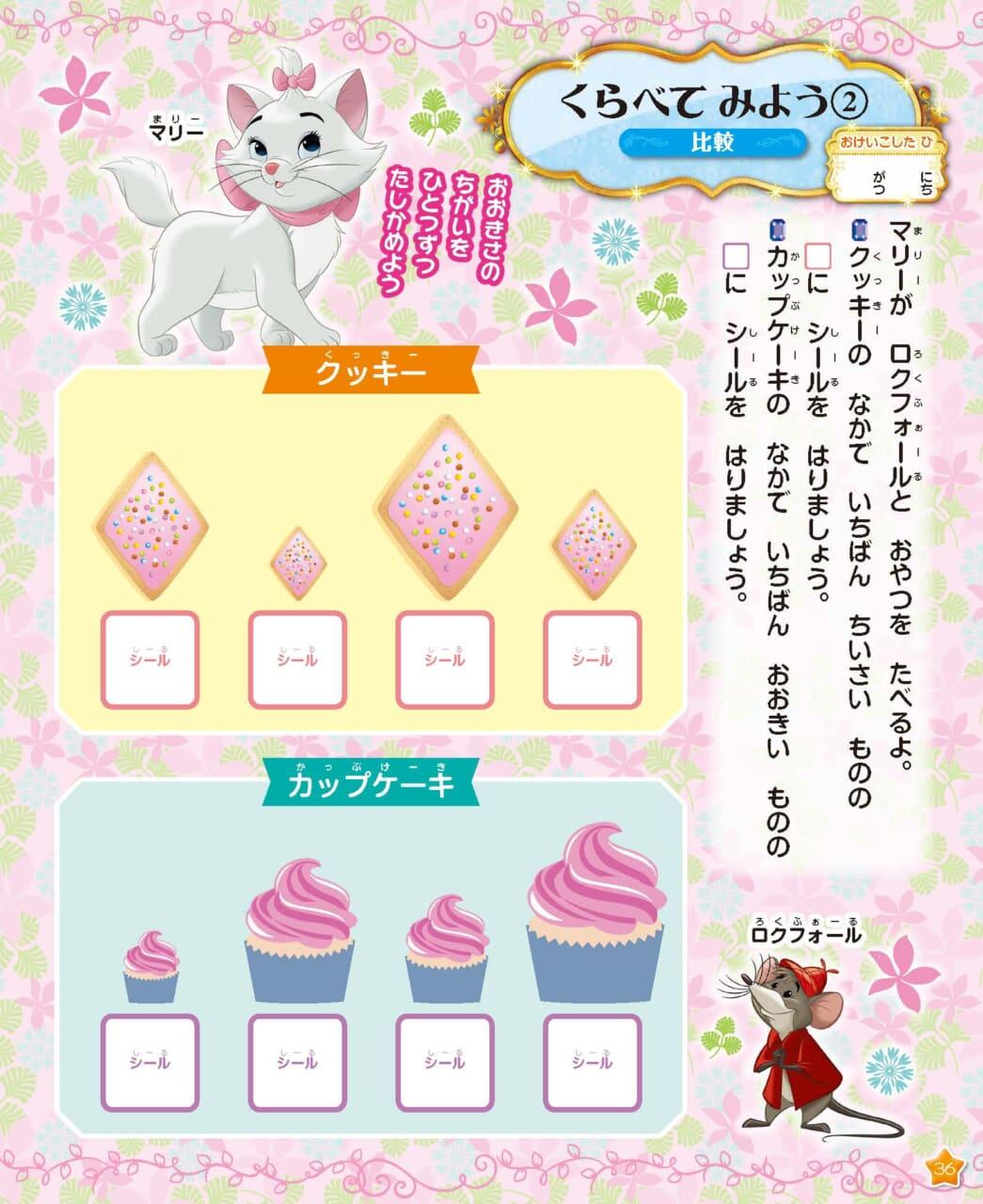 ディズニーの物語にまつわるわくわくする内容や、かわいいキャラクターのシールを貼る問題で構成されているので、遊び感覚で取り組むことができます。