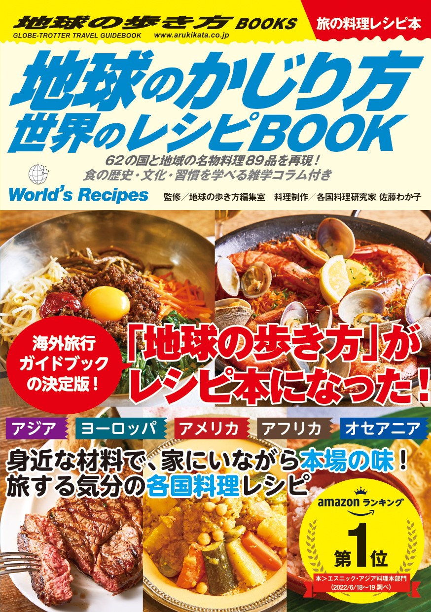 『地球のかじり方 世界のレシピBOOK』は、海外旅行ガイドブックの決定版「地球の歩き方」の全面協力によって実現した、世界のグルメを楽しめるレシピ本。日本で入手できる食材&調味料を使って、62の国と地域の名物料理89品を再現できるレシピを紹介しています。食文化・食の歴史・食習慣など、現地取材データをもとにしたリアルな情報や、「食」に特化した世界の雑学も満載で、家にいながら海外旅行気分、外食気分を味わえると評判です。