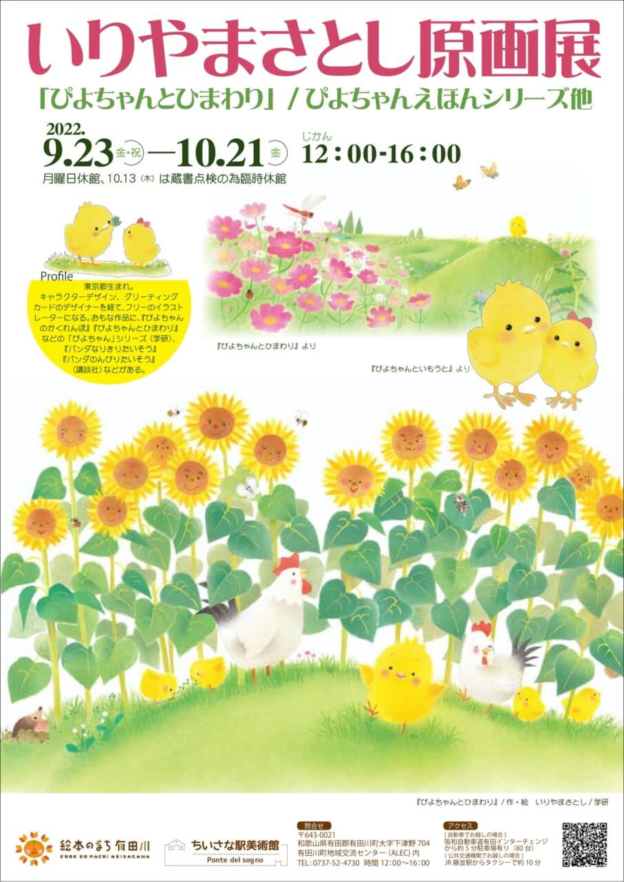 ぴよちゃんのえほんシリーズは、作者・いりやまさとしさんの描く、ふわふわで優しいタッチの絵が人気の乳幼児向けの絵本です。このたび、和歌山で、絵本『ぴよちゃんとひまわり』を中心に、「ぴよちゃん」シリーズの原画を多数展示する「いりやまさとし原画展」を開催いたします。
