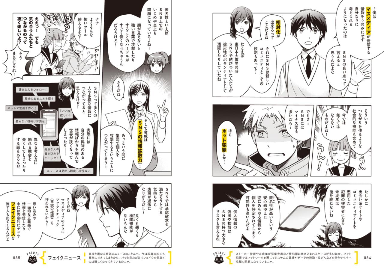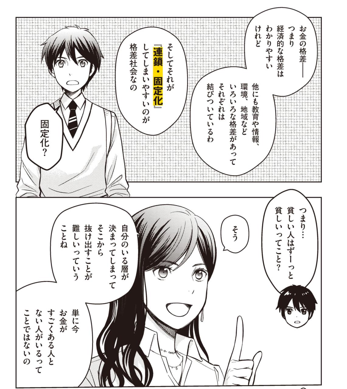 「格差社会が進むと、何が起こるのか?」「なぜ未婚率が増加しているのか?」「AIによって雇用が奪われるのか?」「SNSは社会にどんな影響をもたらしたのか?」「高齢者の免許は返納すべき?」など……基礎的な背景知識を紹介しつつ、ニュースになっているような事例や意見例を交え、さまざまな議論がマンガのなかで展開される。受験生はもちろん、大人が読んでも面白い話題が多く、入試に限らず、現代を生きていくための教養としておさえておきたい視点ばかりだ。