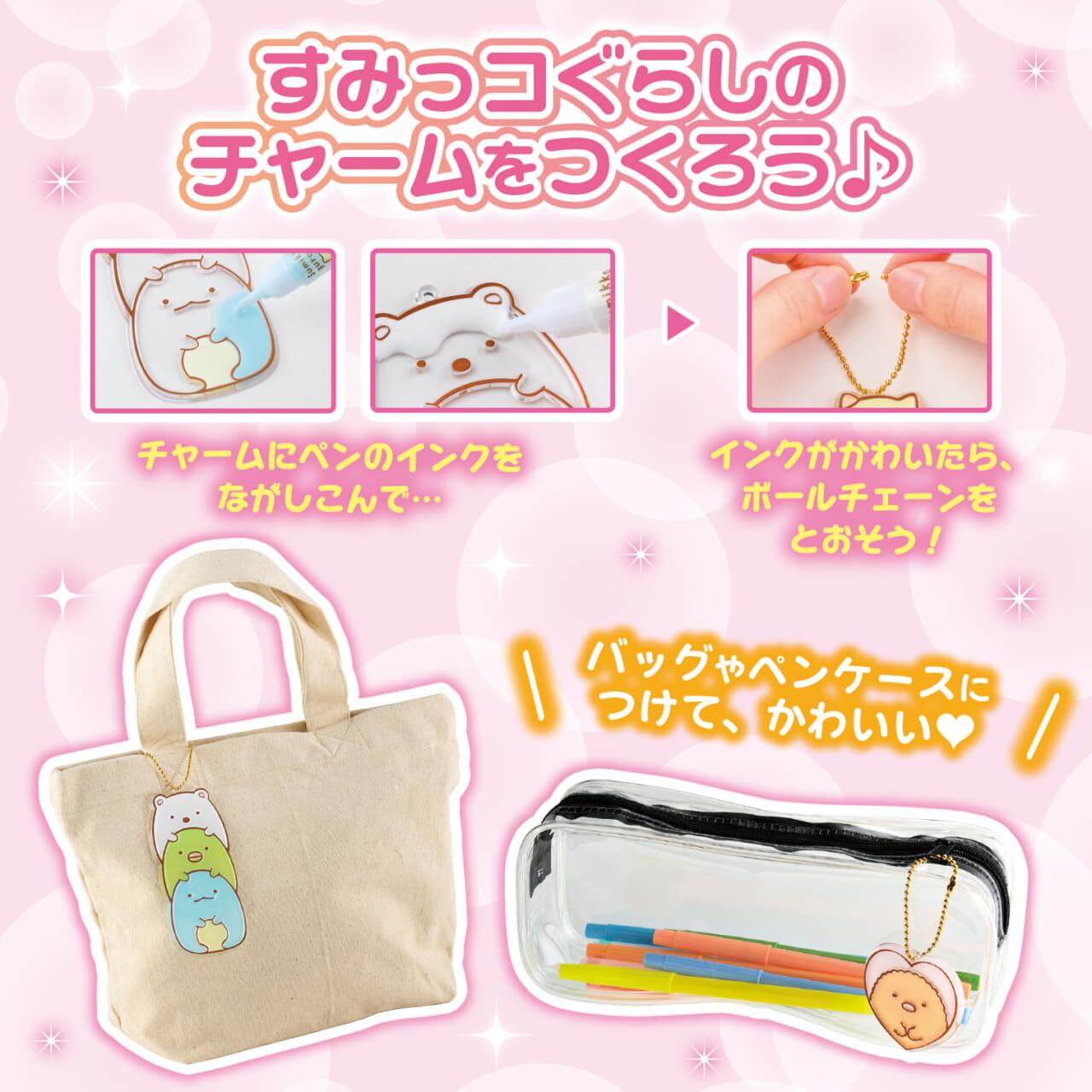透明のチャームにペンのインクを流し込むだけで、簡単にすみっコぐらしのチャームが作れるセットです。チャームは、しろくま&ぺんぎん?&とかげ、とんかつ、ねこの3種類。