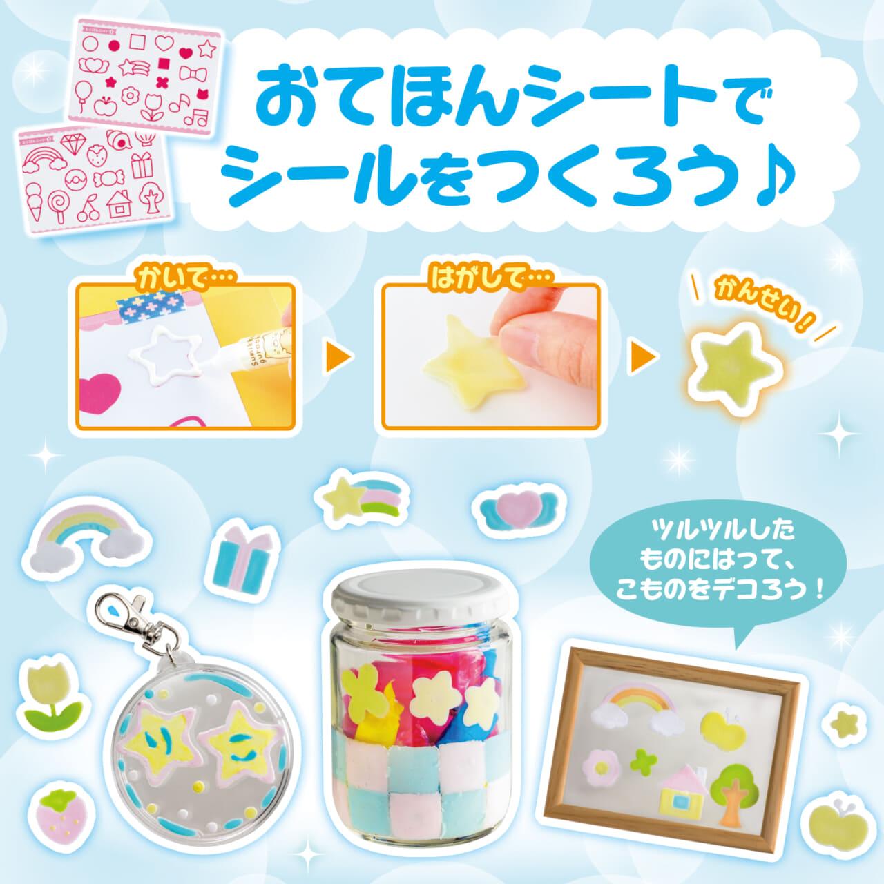 さらに、おえかきシールペンで絵を描いて、インクを乾かすと…。ツルツルしたところに貼ってはがせる、ふしぎなシールを作ることができます。本誌のおてほんシートでは、アイスクリームやキャンディ、ながれぼしなど、かわいいイラストを紹介。同梱のとうめいシートを上に置いて、なぞりがきすれば、かわいいシールが作れます♪ ガラスやプラスチックなど、ツルツルしたものに貼って、こものデコを楽しみましょう!