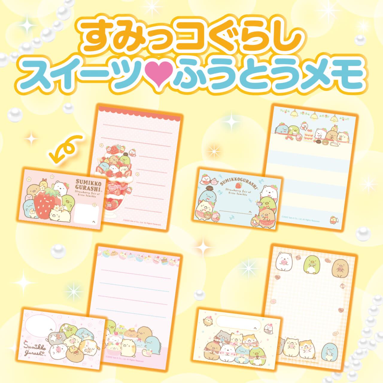 いちごやスイーツを楽しむすみっコたちがかわいいメモです。2回折るだけで、簡単に封筒のようになるデザインがとってもすてき! メッセージをかいて、大切な人にプレゼントしてくださいね。