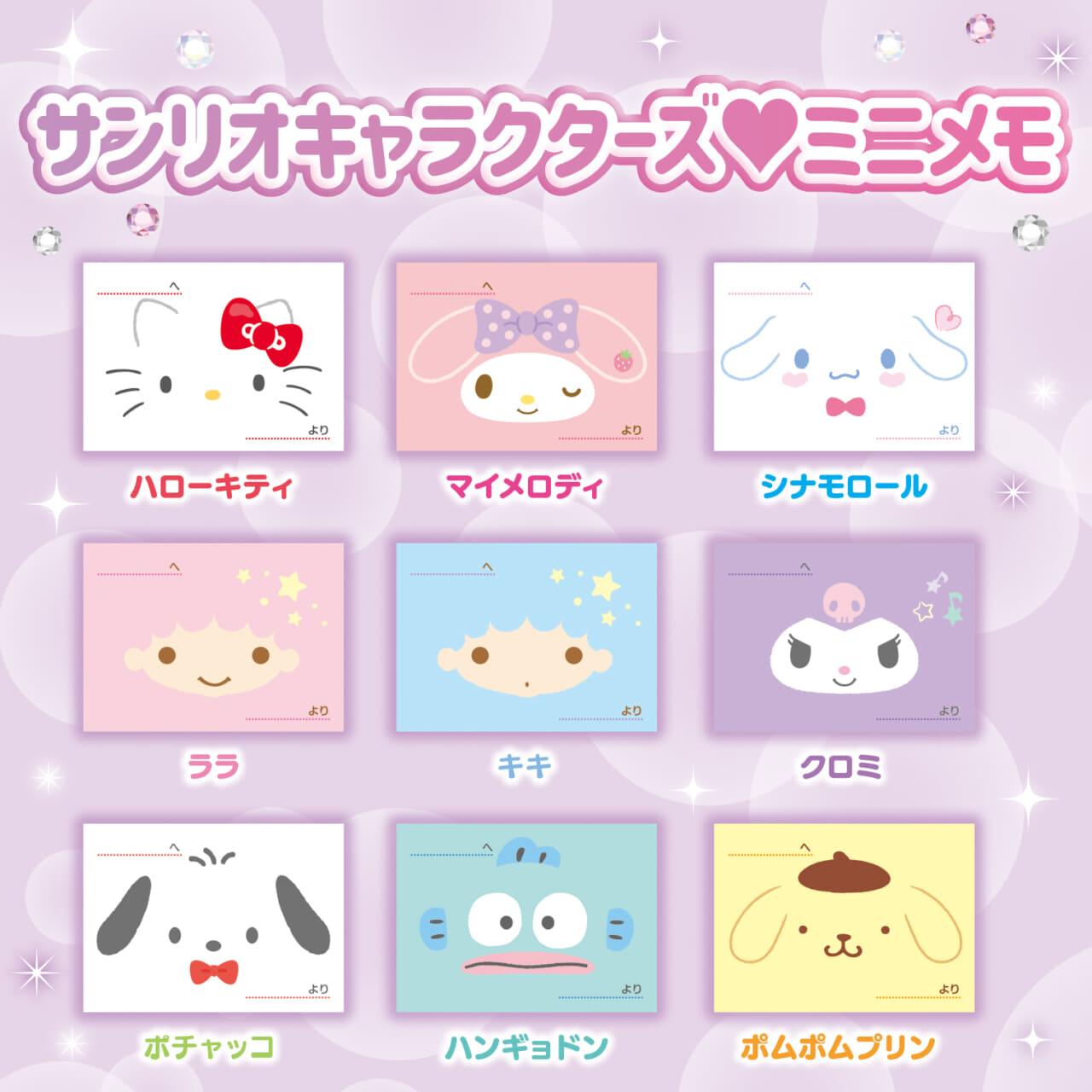 キャラクターの顔が全面に! とってもかわいいサンリオキャラクターズのメモです。キャラクターは、ハローキティ、マイメロディ、シナモロール、ララ、キキ、クロミ、ポチャッコ、ハンギョドン、ポムポムプリンと全部で9キャラクターも! 豪華なミニメモです。