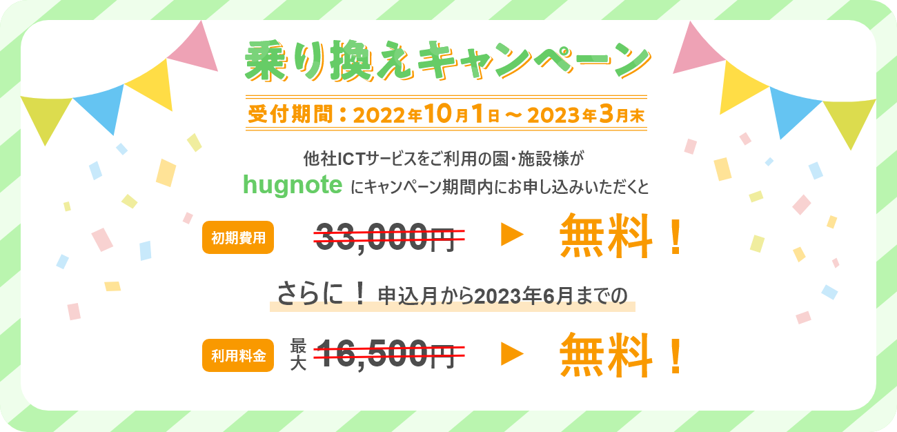 「hugmo(ハグモー)」は、ICTを活用した園業務支援ならびに保護者とのコミュニケーション(hugnote)をはじめ、園児の健康管理(hugsafety)、バス位置情報通知(huglocation)、写真販売(hugphoto)、商品販売(hugselection)など幼保園施設等の運営に関わる様々な機能を1つのサービスとして総合的に提供する保育ICTサービスです。今回の「乗り換えキャンペーン」では、他社の保育ICTサービスをご利用中の幼稚園・保育園・施設等が新規に「hugnote」にお申し込みいただいた場合、初期費用のみならず2023年6月末までのサービス月額利用料も無料にいたします。この機会にぜひ「hugnote」にお申し込みください。