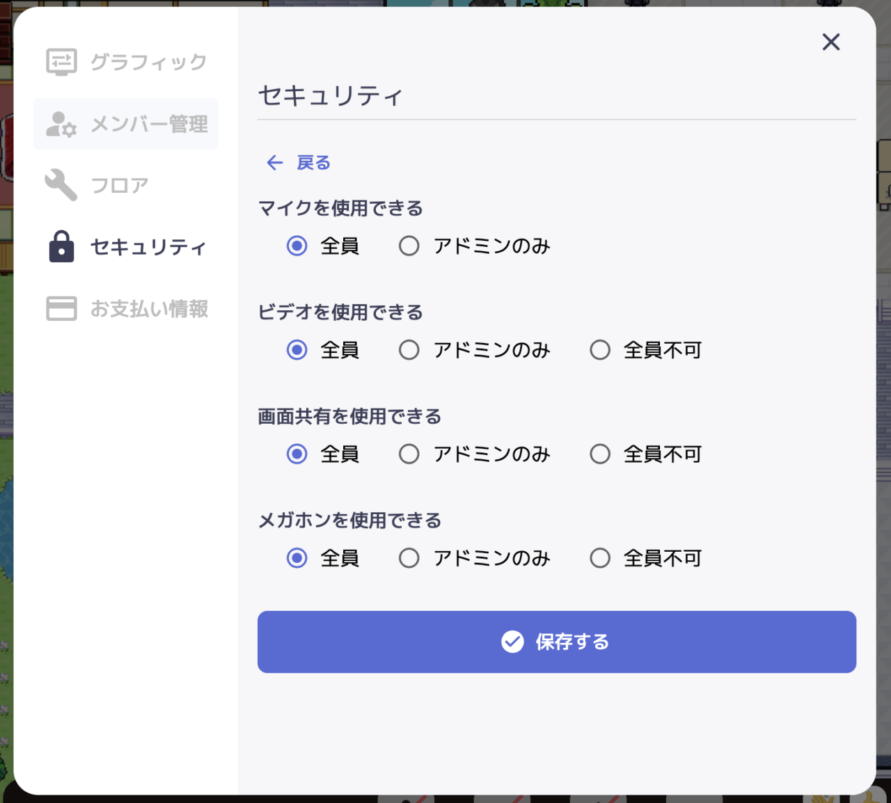 これまでのMetaLifeでは、マイクやビデオなど、基本的な機能は全員が利用でき、使用の制限などは行えませんでした。