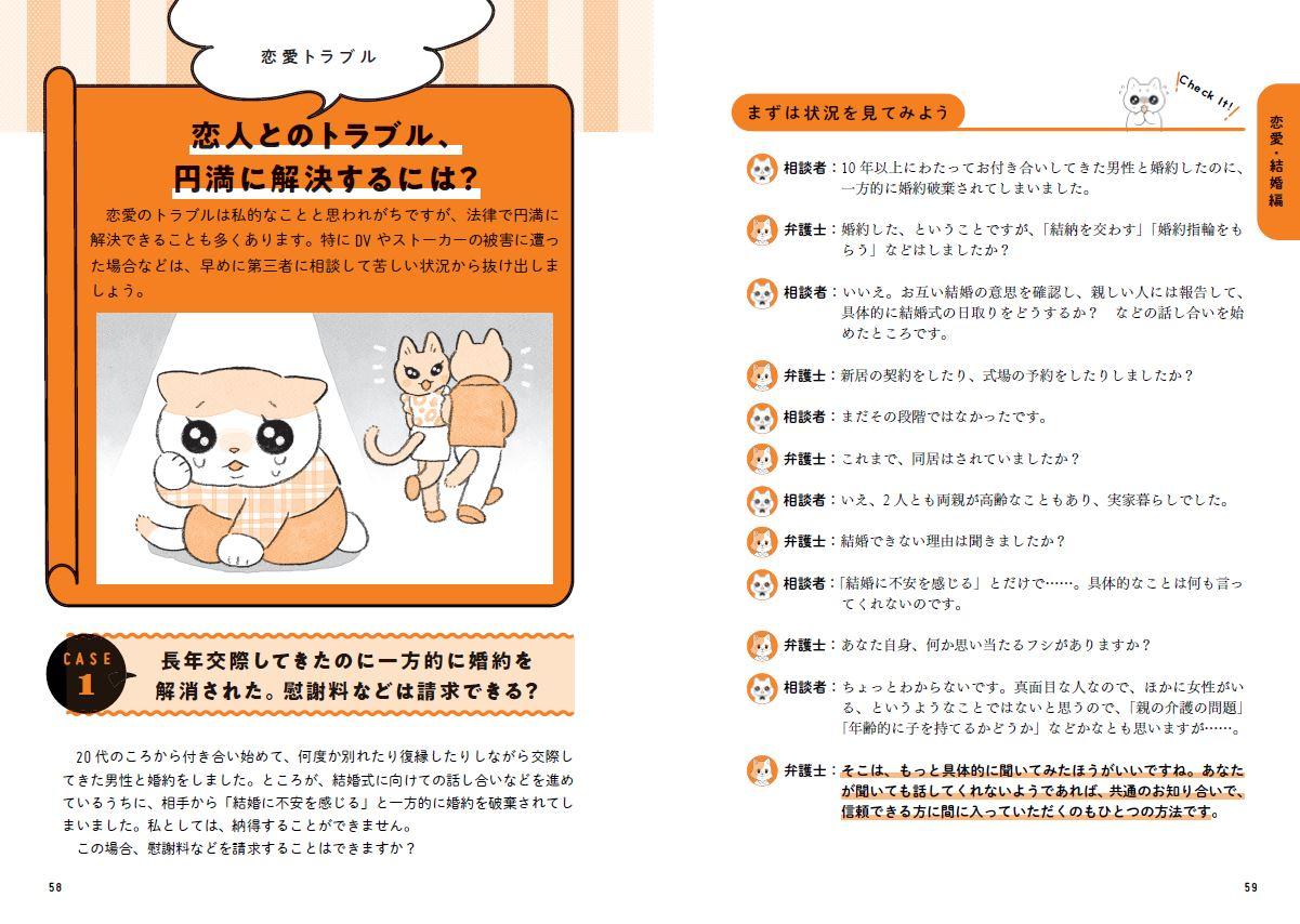 悩みの数は尽きませんが、本書では「女性」や「おひとりさま」の生活全般において起こり得る悩みやトラブルにフォーカスし、約60の事例を「仕事・職場編」「愛・結婚編」「生活編」「家族編」「老後編」のカテゴリーに分け、相談者が弁護士に悩みを打ち明ける会話形式で紹介していきます。