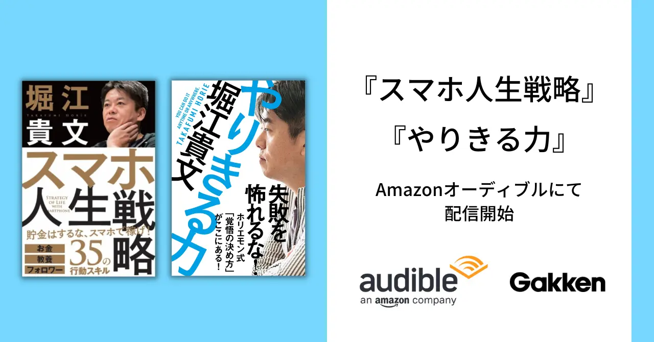 株式会社 学研ホールディングス(東京・品川/代表取締役社長:宮原博昭)のグループ会社、株式会社 Gakken(東京・品川/代表取締役社長:五郎丸徹)は、2022年9月30日(金)に堀江貴文著作の『スマホ人生戦略 お金・教養・フォロワー35の行動スキル』、10月14日(金)に『やりきる力』のオーディオブックをAmazonオーディブル(以下、Audible)の会員向け聴き放題対象作品として配信を開始しました。