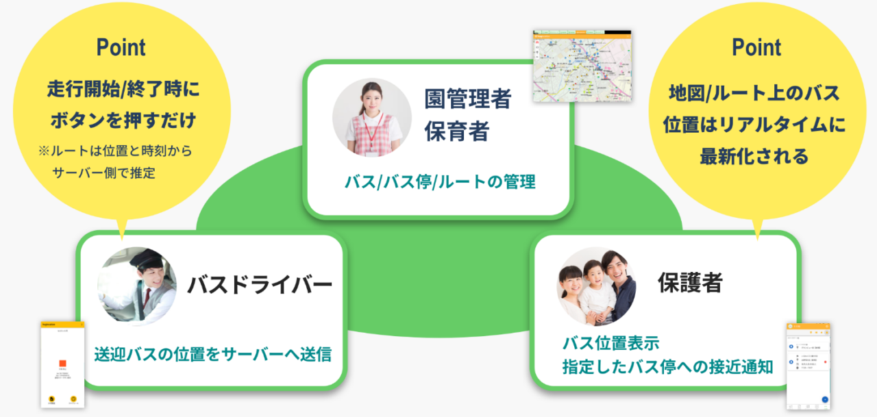 園バス登録、バス停登録、園舎(拠点)登録、送迎ルート設定、移動ログ保存、バス位置情報表示、渋滞情報表示